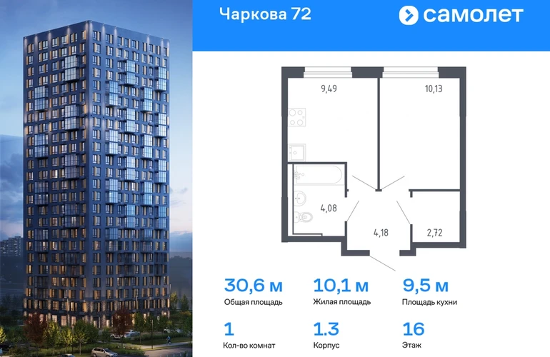 Строим кварталы для жизни с заботой о будущем. Предлагается 1-комнатная квартира комфорт-класса 30,6 кв.м в корпусе 1.3 на 16 этаже, в ЖК «Чаркова 72» Квартира с предчистовой отделкой. Доступность дополнительных опций уточняйте у застройщика. Приобрести квартиру возможно по специальным акциям от застройщика, с текущими условиями акций можно ознакомиться в блоке «Акций». Цена динамическая и может отличаться, уточняйте актуальность у застройщика. Идеальное сочетание городского комфорта и размеренной жизни — квартал «Чаркова 72» на северо-востоке города. В дизайне 17-24-этажных домов с панорамными балконами нашли отражение нотки сибирской природы. От «Чаркова 72» удобно добираться до центра города — всего 17 минут пути. А в 2 минутах от дома находится Тобольский тракт. Для семейного отдыха отлично подойдет парк Гагарина — он находится в 7 минутах от квартала. В закрытых дворах тихо и уютно — все авто остались на одном из 4 многоуровневых паркингов, которые находятся за территорией квартала. Можно спокойно гулять по бульвару и заниматься йогой на спортивной площадке. На первых этажах домов — кафе и магазины. Рядом с проектом — детские сады и школы, городская поликлиника и МФЦ. Во всех квартирах есть выводы под кондиционеры, на подземных этажах — индивидуальные кладовые, на первых — места для хранения велосипедов и колясок. В квартирах можно выбрать варианты отделки: чистовая, черновая и улучшенная из материалов повышенного класса.#yan19-2r1495463#О застройщике
