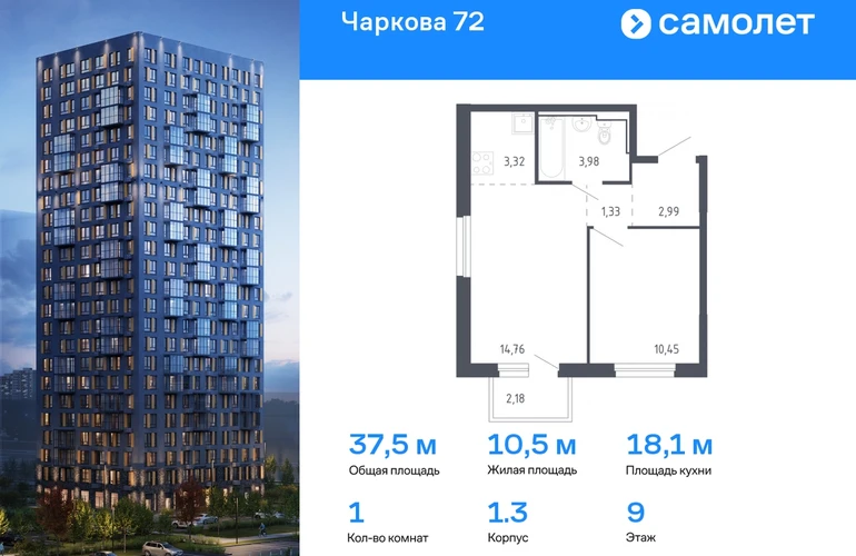 Строим кварталы для жизни с заботой о будущем. Предлагается 1-комнатная квартира комфорт-класса 37,48 кв.м в корпусе 1.3 на 9 этаже, в ЖК «Чаркова 72» Квартира с предчистовой отделкой. Доступность дополнительных опций уточняйте у застройщика. Приобрести квартиру возможно по специальным акциям от застройщика, с текущими условиями акций можно ознакомиться в блоке «Акций». Цена динамическая и может отличаться, уточняйте актуальность у застройщика. Идеальное сочетание городского комфорта и размеренной жизни — квартал «Чаркова 72» на северо-востоке города. В дизайне 17-24-этажных домов с панорамными балконами нашли отражение нотки сибирской природы. От «Чаркова 72» удобно добираться до центра города — всего 17 минут пути. А в 2 минутах от дома находится Тобольский тракт. Для семейного отдыха отлично подойдет парк Гагарина — он находится в 7 минутах от квартала. В закрытых дворах тихо и уютно — все авто остались на одном из 4 многоуровневых паркингов, которые находятся за территорией квартала. Можно спокойно гулять по бульвару и заниматься йогой на спортивной площадке. На первых этажах домов — кафе и магазины. Рядом с проектом — детские сады и школы, городская поликлиника и МФЦ. Во всех квартирах есть выводы под кондиционеры, на подземных этажах — индивидуальные кладовые, на первых — места для хранения велосипедов и колясок. В квартирах можно выбрать варианты отделки: чистовая, черновая и улучшенная из материалов повышенного класса.#yan19-2r1517930#О застройщике
