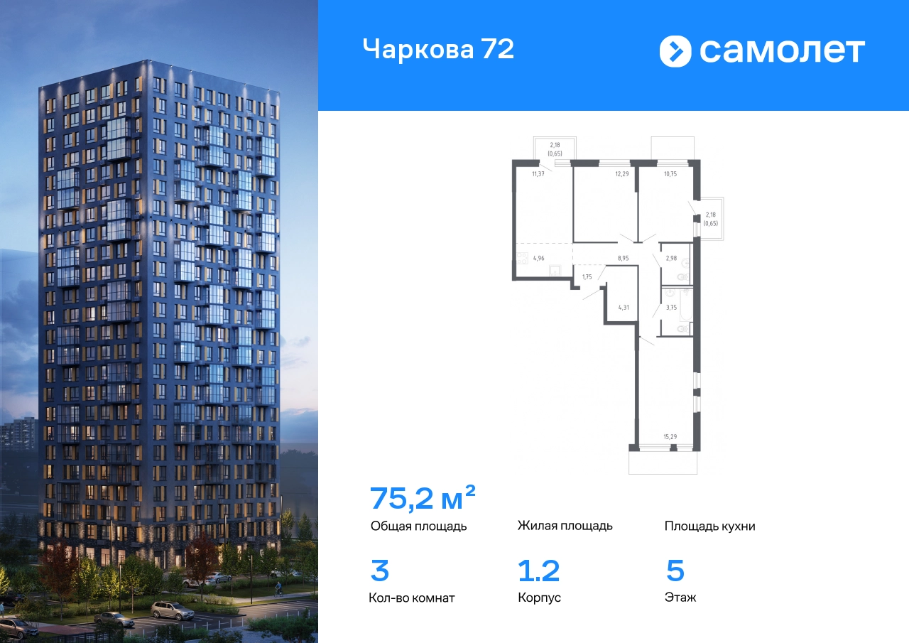 Предлагается 3-комнатная квартира комфорт-класса 75,2 кв.м в корпусе 1.2 на 5 этаже, в ЖК «Чаркова 72» Квартира с чистовой отделкой. Доступность дополнительных опций уточняйте у застройщика. Приобрести квартиру возможно по специальным акциям от застройщика, с текущими условиями акций можно ознакомиться в блоке «Акций». Цена динамическая и может отличаться, уточняйте актуальность у застройщика. Идеальное сочетание городского комфорта и размеренной жизни — квартал «Чаркова 72» на северо-востоке города. В дизайне 17-24-этажных домов с панорамными балконами нашли отражение нотки сибирской природы. От «Чаркова 72» удобно добираться до центра города — всего 17 минут пути. А в 2 минутах от дома находится Тобольский тракт. Для семейного отдыха отлично подойдет парк Гагарина — он находится в 7 минутах от квартала. В закрытых дворах тихо и уютно — все авто остались на одном из 4 многоуровневых паркингов, которые находятся за территорией квартала. Можно спокойно гулять по бульвару и заниматься йогой на спортивной площадке. На первых этажах домов — кафе и магазины. Рядом с проектом — детские сады и школы, городская поликлиника и МФЦ. Во всех квартирах есть выводы под кондиционеры, на подземных этажах — индивидуальные кладовые, на первых — места для хранения велосипедов и колясок. В квартирах можно выбрать варианты отделки: чистовая, черновая и улучшенная из материалов повышенного класса.#yan19-2r1557940#О застройщике