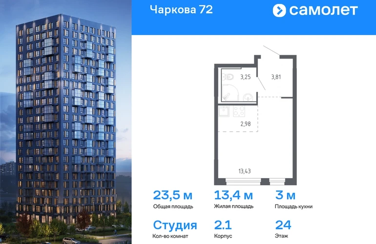 Строим кварталы для жизни с заботой о будущем. Предлагается квартира студия комфорт-класса 23,47 кв.м в корпусе 2.1 на 24 этаже, в ЖК «Чаркова 72» Квартира с чистовой отделкой. Доступность дополнительных опций уточняйте у застройщика. Приобрести квартиру возможно по специальным акциям от застройщика, с текущими условиями акций можно ознакомиться в блоке «Акций». Цена динамическая и может отличаться, уточняйте актуальность у застройщика. Идеальное сочетание городского комфорта и размеренной жизни — квартал «Чаркова 72» на северо-востоке города. В дизайне 17-24-этажных домов с панорамными балконами нашли отражение нотки сибирской природы. От «Чаркова 72» удобно добираться до центра города — всего 17 минут пути. А в 2 минутах от дома находится Тобольский тракт. Для семейного отдыха отлично подойдет парк Гагарина — он находится в 7 минутах от квартала. В закрытых дворах тихо и уютно — все авто остались на одном из 4 многоуровневых паркингов, которые находятся за территорией квартала. Можно спокойно гулять по бульвару и заниматься йогой на спортивной площадке. На первых этажах домов — кафе и магазины. Рядом с проектом — детские сады и школы, городская поликлиника и МФЦ. Во всех квартирах есть выводы под кондиционеры, на подземных этажах — индивидуальные кладовые, на первых — места для хранения велосипедов и колясок. В квартирах можно выбрать варианты отделки: чистовая, черновая и улучшенная из материалов повышенного класса.#yan19-2r1570009#О застройщике