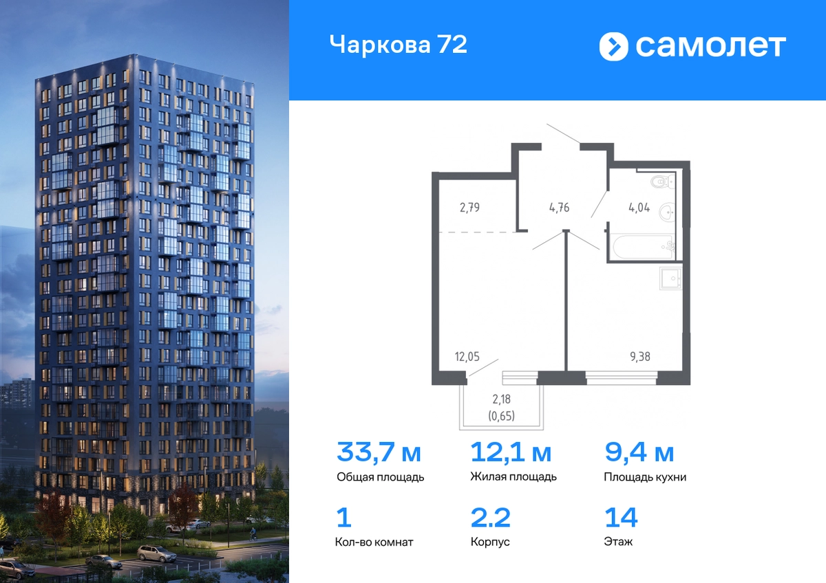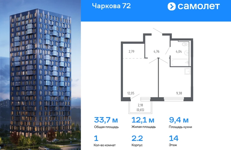 Строим кварталы для жизни с заботой о будущем. Предлагается 1-комнатная квартира комфорт-класса 33,67 кв.м в корпусе 2.2 на 14 этаже, в ЖК «Чаркова 72» Квартира с предчистовой отделкой. Доступность дополнительных опций уточняйте у застройщика. Приобрести квартиру возможно по специальным акциям от застройщика, с текущими условиями акций можно ознакомиться в блоке «Акций». Цена динамическая и может отличаться, уточняйте актуальность у застройщика. Идеальное сочетание городского комфорта и размеренной жизни — квартал «Чаркова 72» на северо-востоке города. В дизайне 17-24-этажных домов с панорамными балконами нашли отражение нотки сибирской природы. От «Чаркова 72» удобно добираться до центра города — всего 17 минут пути. А в 2 минутах от дома находится Тобольский тракт. Для семейного отдыха отлично подойдет парк Гагарина — он находится в 7 минутах от квартала. В закрытых дворах тихо и уютно — все авто остались на одном из 4 многоуровневых паркингов, которые находятся за территорией квартала. Можно спокойно гулять по бульвару и заниматься йогой на спортивной площадке. На первых этажах домов — кафе и магазины. Рядом с проектом — детские сады и школы, городская поликлиника и МФЦ. Во всех квартирах есть выводы под кондиционеры, на подземных этажах — индивидуальные кладовые, на первых — места для хранения велосипедов и колясок. В квартирах можно выбрать варианты отделки: чистовая, черновая и улучшенная из материалов повышенного класса.#yan19-2r1570058#О застройщике