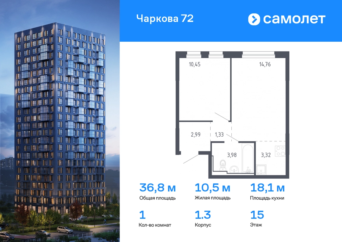 Строим кварталы для жизни с заботой о будущем. Предлагается 1-комнатная квартира комфорт-класса 36,83 кв.м в корпусе 1.3 на 15 этаже, в ЖК «Чаркова 72» Квартира с предчистовой отделкой. Доступность дополнительных опций уточняйте у застройщика. Приобрести квартиру возможно по специальным акциям от застройщика, с текущими условиями акций можно ознакомиться в блоке «Акций». Цена динамическая и может отличаться, уточняйте актуальность у застройщика. Идеальное сочетание городского комфорта и размеренной жизни — квартал «Чаркова 72» на северо-востоке города. В дизайне 17-24-этажных домов с панорамными балконами нашли отражение нотки сибирской природы. От «Чаркова 72» удобно добираться до центра города — всего 17 минут пути. А в 2 минутах от дома находится Тобольский тракт. Для семейного отдыха отлично подойдет парк Гагарина — он находится в 7 минутах от квартала. В закрытых дворах тихо и уютно — все авто остались на одном из 4 многоуровневых паркингов, которые находятся за территорией квартала. Можно спокойно гулять по бульвару и заниматься йогой на спортивной площадке. На первых этажах домов — кафе и магазины. Рядом с проектом — детские сады и школы, городская поликлиника и МФЦ. Во всех квартирах есть выводы под кондиционеры, на подземных этажах — индивидуальные кладовые, на первых — места для хранения велосипедов и колясок. В квартирах можно выбрать варианты отделки: чистовая, черновая и улучшенная из материалов повышенного класса.#yan19-2r1574109#О застройщике