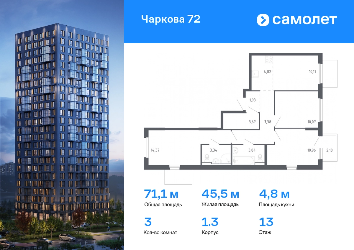 Предлагается 3-комнатная квартира комфорт-класса 71,14 кв.м в корпусе 1.3 на 13 этаже, в ЖК «Чаркова 72» Квартира с предчистовой отделкой. Доступность дополнительных опций уточняйте у застройщика. Приобрести квартиру возможно по специальным акциям от застройщика, с текущими условиями акций можно ознакомиться в блоке “Акций”. Цена динамическая и может отличаться, уточняйте актуальность у застройщика. Идеальное сочетание городского комфорта и размеренной жизни — квартал «Чаркова 72» на северо-востоке города. В дизайне 17-24-этажных домов с панорамными балконами нашли отражение нотки сибирской природы. От «Чаркова 72» удобно добираться до центра города — всего 17 минут пути. А в 2 минутах от дома находится Тобольский тракт. Для семейного отдыха отлично подойдет парк Гагарина — он находится в 7 минутах от квартала. В закрытых дворах тихо и уютно — все авто остались на одном из 4 многоуровневых паркингов, которые находятся за территорией квартала. Можно спокойно гулять по бульвару и заниматься йогой на спортивной площадке. На первых этажах домов — кафе и магазины. Рядом с проектом — детские сады и школы, городская поликлиника и МФЦ. Во всех квартирах есть выводы под кондиционеры, на подземных этажах — индивидуальные кладовые, на первых — места для хранения велосипедов и колясок. В квартирах можно выбрать варианты отделки: чистовая, черновая и улучшенная из материалов повышенного класса.#yan19-2r1574129#О застройщике