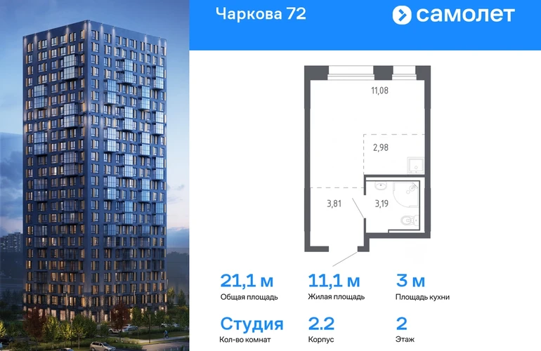 Строим кварталы для жизни с заботой о будущем. Предлагается квартира студия комфорт-класса 21,06 кв.м в корпусе 2.2 на 2 этаже, в ЖК «Чаркова 72» Квартира с предчистовой отделкой. Доступность дополнительных опций уточняйте у застройщика. Приобрести квартиру возможно по специальным акциям от застройщика, с текущими условиями акций можно ознакомиться в блоке «Акций». Цена динамическая и может отличаться, уточняйте актуальность у застройщика. Идеальное сочетание городского комфорта и размеренной жизни — квартал «Чаркова 72» на северо-востоке города. В дизайне 17-24-этажных домов с панорамными балконами нашли отражение нотки сибирской природы. От «Чаркова 72» удобно добираться до центра города — всего 17 минут пути. А в 2 минутах от дома находится Тобольский тракт. Для семейного отдыха отлично подойдет парк Гагарина — он находится в 7 минутах от квартала. В закрытых дворах тихо и уютно — все авто остались на одном из 4 многоуровневых паркингов, которые находятся за территорией квартала. Можно спокойно гулять по бульвару и заниматься йогой на спортивной площадке. На первых этажах домов — кафе и магазины. Рядом с проектом — детские сады и школы, городская поликлиника и МФЦ. Во всех квартирах есть выводы под кондиционеры, на подземных этажах — индивидуальные кладовые, на первых — места для хранения велосипедов и колясок. В квартирах можно выбрать варианты отделки: чистовая, черновая и улучшенная из материалов повышенного класса.#yan19-2r1582021#О застройщике