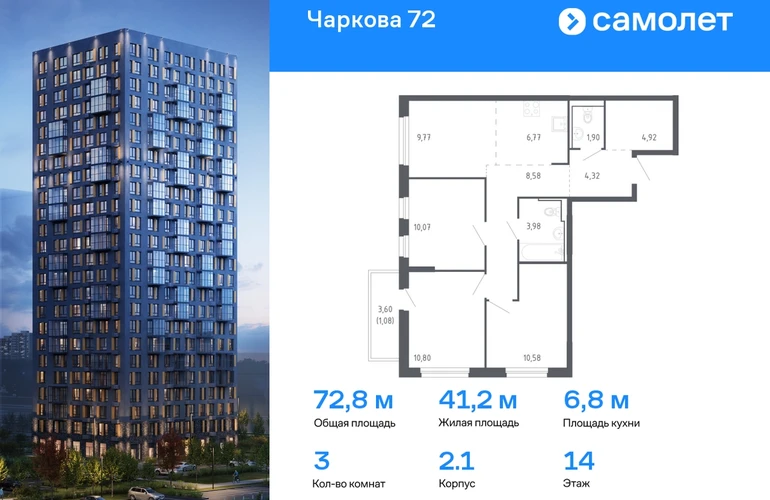 Строим кварталы для жизни с заботой о будущем. Предлагается 3-комнатная квартира комфорт-класса 72,77 кв.м в корпусе 2.1 на 14 этаже, в ЖК «Чаркова 72» Квартира с чистовой отделкой. Доступность дополнительных опций уточняйте у застройщика. Приобрести квартиру возможно по специальным акциям от застройщика, с текущими условиями акций можно ознакомиться в блоке «Акций». Цена динамическая и может отличаться, уточняйте актуальность у застройщика. Идеальное сочетание городского комфорта и размеренной жизни — квартал «Чаркова 72» на северо-востоке города. В дизайне 17-24-этажных домов с панорамными балконами нашли отражение нотки сибирской природы. От «Чаркова 72» удобно добираться до центра города — всего 17 минут пути. А в 2 минутах от дома находится Тобольский тракт. Для семейного отдыха отлично подойдет парк Гагарина — он находится в 7 минутах от квартала. В закрытых дворах тихо и уютно — все авто остались на одном из 4 многоуровневых паркингов, которые находятся за территорией квартала. Можно спокойно гулять по бульвару и заниматься йогой на спортивной площадке. На первых этажах домов — кафе и магазины. Рядом с проектом — детские сады и школы, городская поликлиника и МФЦ. Во всех квартирах есть выводы под кондиционеры, на подземных этажах — индивидуальные кладовые, на первых — места для хранения велосипедов и колясок. В квартирах можно выбрать варианты отделки: чистовая, черновая и улучшенная из материалов повышенного класса.#yan19-2r1585478#О застройщике