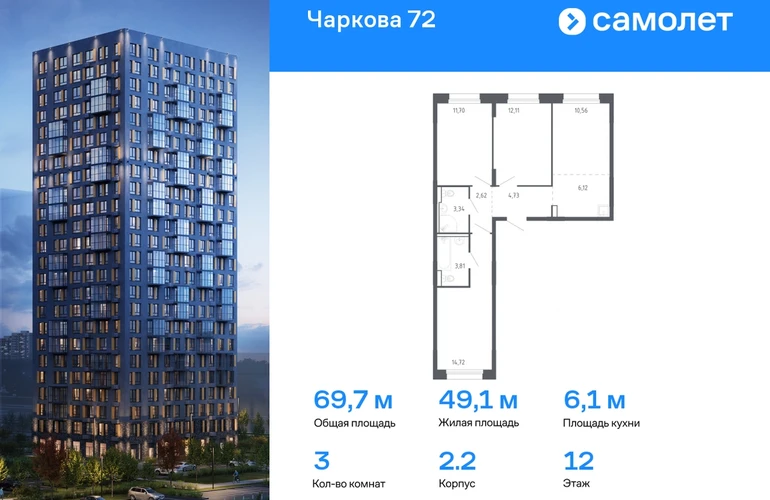 Строим кварталы для жизни с заботой о будущем. Предлагается 3-комнатная квартира комфорт-класса 69,71 кв.м в корпусе 2.2 на 12 этаже, в ЖК «Чаркова 72» Квартира с предчистовой отделкой. Доступность дополнительных опций уточняйте у застройщика. Приобрести квартиру возможно по специальным акциям от застройщика, с текущими условиями акций можно ознакомиться в блоке «Акций». Цена динамическая и может отличаться, уточняйте актуальность у застройщика. Идеальное сочетание городского комфорта и размеренной жизни — квартал «Чаркова 72» на северо-востоке города. В дизайне 17-24-этажных домов с панорамными балконами нашли отражение нотки сибирской природы. От «Чаркова 72» удобно добираться до центра города — всего 17 минут пути. А в 2 минутах от дома находится Тобольский тракт. Для семейного отдыха отлично подойдет парк Гагарина — он находится в 7 минутах от квартала. В закрытых дворах тихо и уютно — все авто остались на одном из 4 многоуровневых паркингов, которые находятся за территорией квартала. Можно спокойно гулять по бульвару и заниматься йогой на спортивной площадке. На первых этажах домов — кафе и магазины. Рядом с проектом — детские сады и школы, городская поликлиника и МФЦ. Во всех квартирах есть выводы под кондиционеры, на подземных этажах — индивидуальные кладовые, на первых — места для хранения велосипедов и колясок. В квартирах можно выбрать варианты отделки: чистовая, черновая и улучшенная из материалов повышенного класса.#yan19-2r1585532#О застройщике