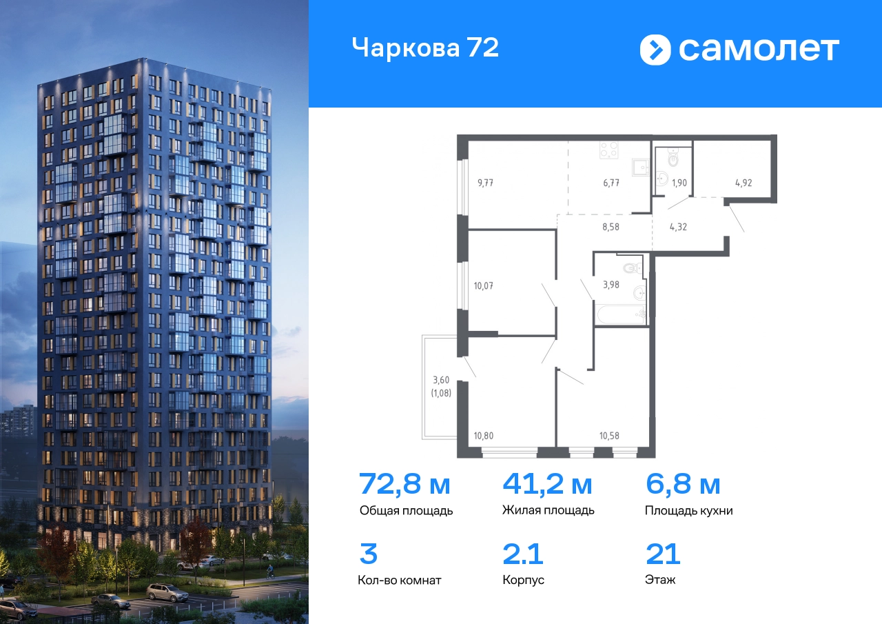 Строим кварталы для жизни с заботой о будущем. Предлагается 3-комнатная квартира комфорт-класса 72,77 кв.м в корпусе 2.1 на 21 этаже, в ЖК «Чаркова 72» Квартира с чистовой отделкой. Доступность дополнительных опций уточняйте у застройщика. Приобрести квартиру возможно по специальным акциям от застройщика, с текущими условиями акций можно ознакомиться в блоке «Акций». Цена динамическая и может отличаться, уточняйте актуальность у застройщика. Идеальное сочетание городского комфорта и размеренной жизни — квартал «Чаркова 72» на северо-востоке города. В дизайне 17-24-этажных домов с панорамными балконами нашли отражение нотки сибирской природы. От «Чаркова 72» удобно добираться до центра города — всего 17 минут пути. А в 2 минутах от дома находится Тобольский тракт. Для семейного отдыха отлично подойдет парк Гагарина — он находится в 7 минутах от квартала. В закрытых дворах тихо и уютно — все авто остались на одном из 4 многоуровневых паркингов, которые находятся за территорией квартала. Можно спокойно гулять по бульвару и заниматься йогой на спортивной площадке. На первых этажах домов — кафе и магазины. Рядом с проектом — детские сады и школы, городская поликлиника и МФЦ. Во всех квартирах есть выводы под кондиционеры, на подземных этажах — индивидуальные кладовые, на первых — места для хранения велосипедов и колясок. В квартирах можно выбрать варианты отделки: чистовая, черновая и улучшенная из материалов повышенного класса.#yan19-2r1589876#О застройщике