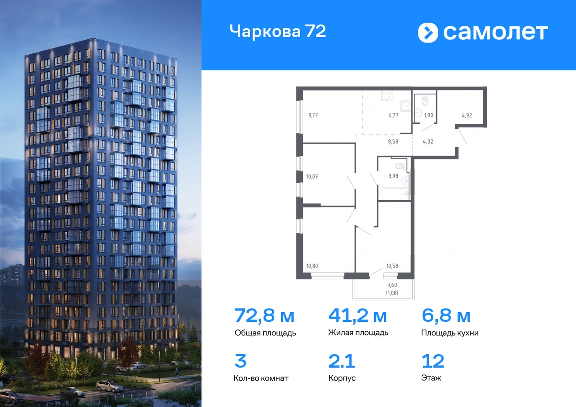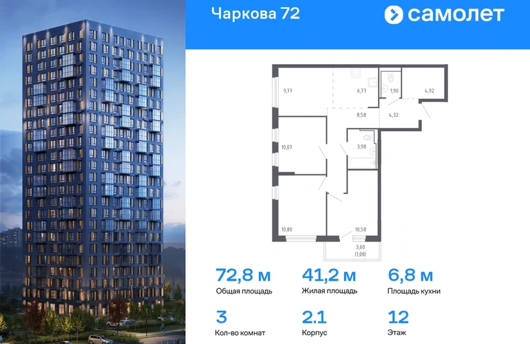 Строим кварталы для жизни с заботой о будущем. Предлагается 3-комнатная квартира комфорт-класса 72,77 кв.м в корпусе 2.1 на 12 этаже, в ЖК «Чаркова 72» Квартира с чистовой отделкой. Доступность дополнительных опций уточняйте у застройщика. Приобрести квартиру возможно по специальным акциям от застройщика, с текущими условиями акций можно ознакомиться в блоке «Акций». Цена динамическая и может отличаться, уточняйте актуальность у застройщика. Идеальное сочетание городского комфорта и размеренной жизни — квартал «Чаркова 72» на северо-востоке города. В дизайне 17-24-этажных домов с панорамными балконами нашли отражение нотки сибирской природы. От «Чаркова 72» удобно добираться до центра города — всего 17 минут пути. А в 2 минутах от дома находится Тобольский тракт. Для семейного отдыха отлично подойдет парк Гагарина — он находится в 7 минутах от квартала. В закрытых дворах тихо и уютно — все авто остались на одном из 4 многоуровневых паркингов, которые находятся за территорией квартала. Можно спокойно гулять по бульвару и заниматься йогой на спортивной площадке. На первых этажах домов — кафе и магазины. Рядом с проектом — детские сады и школы, городская поликлиника и МФЦ. Во всех квартирах есть выводы под кондиционеры, на подземных этажах — индивидуальные кладовые, на первых — места для хранения велосипедов и колясок. В квартирах можно выбрать варианты отделки: чистовая, черновая и улучшенная из материалов повышенного класса.#yan19-2r1610755#О застройщике