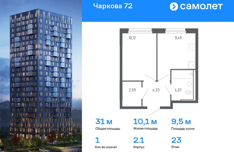 Предлагается 1-комнатная квартира комфорт-класса 31 кв.м в корпусе 2.1 на 23 этаже, в ЖК «Чаркова 72» Квартира с чистовой отделкой. Доступность дополнительных опций уточняйте у застройщика. Приобрести квартиру возможно по специальным акциям от застройщика, с текущими условиями акций можно ознакомиться в блоке “Акций”. Цена динамическая и может отличаться, уточняйте актуальность у застройщика. Идеальное сочетание городского комфорта и размеренной жизни — квартал «Чаркова 72» на северо-востоке города. В дизайне 17-24-этажных домов с панорамными балконами нашли отражение нотки сибирской природы. От «Чаркова 72» удобно добираться до центра города — всего 17 минут пути. А в 2 минутах от дома находится Тобольский тракт. Для семейного отдыха отлично подойдет парк Гагарина — он находится в 7 минутах от квартала. В закрытых дворах тихо и уютно — все авто остались на одном из 4 многоуровневых паркингов, которые находятся за территорией квартала. Можно спокойно гулять по бульвару и заниматься йогой на спортивной площадке. На первых этажах домов — кафе и магазины. Рядом с проектом — детские сады и школы, городская поликлиника и МФЦ. Во всех квартирах есть выводы под кондиционеры, на подземных этажах — индивидуальные кладовые, на первых — места для хранения велосипедов и колясок. В квартирах можно выбрать варианты отделки: чистовая, черновая и улучшенная из материалов повышенного класса.#yan19-2r1621711#О застройщике