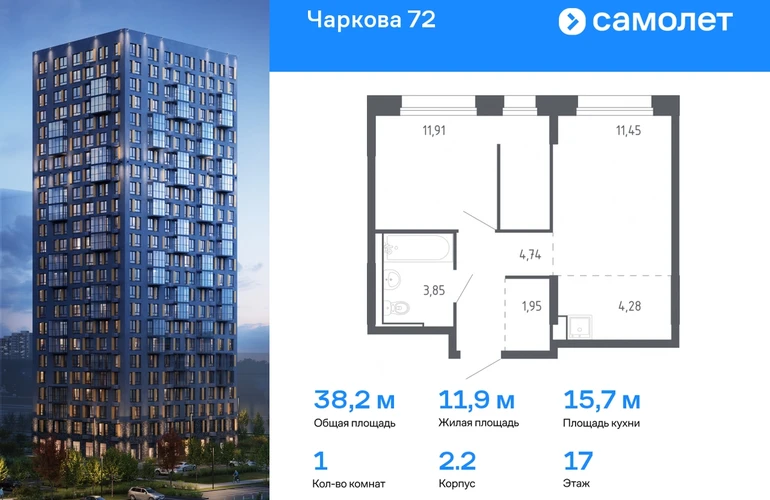 Строим кварталы для жизни с заботой о будущем. Предлагается 1-комнатная квартира комфорт-класса 38,18 кв.м в корпусе 2.2 на 17 этаже, в ЖК «Чаркова 72» Квартира с чистовой отделкой. Доступность дополнительных опций уточняйте у застройщика. Приобрести квартиру возможно по специальным акциям от застройщика, с текущими условиями акций можно ознакомиться в блоке «Акций». Цена динамическая и может отличаться, уточняйте актуальность у застройщика. Идеальное сочетание городского комфорта и размеренной жизни — квартал «Чаркова 72» на северо-востоке города. В дизайне 17-24-этажных домов с панорамными балконами нашли отражение нотки сибирской природы. От «Чаркова 72» удобно добираться до центра города — всего 17 минут пути. А в 2 минутах от дома находится Тобольский тракт. Для семейного отдыха отлично подойдет парк Гагарина — он находится в 7 минутах от квартала. В закрытых дворах тихо и уютно — все авто остались на одном из 4 многоуровневых паркингов, которые находятся за территорией квартала. Можно спокойно гулять по бульвару и заниматься йогой на спортивной площадке. На первых этажах домов — кафе и магазины. Рядом с проектом — детские сады и школы, городская поликлиника и МФЦ. Во всех квартирах есть выводы под кондиционеры, на подземных этажах — индивидуальные кладовые, на первых — места для хранения велосипедов и колясок. В квартирах можно выбрать варианты отделки: чистовая, черновая и улучшенная из материалов повышенного класса.#yan19-2r1621718#О застройщике