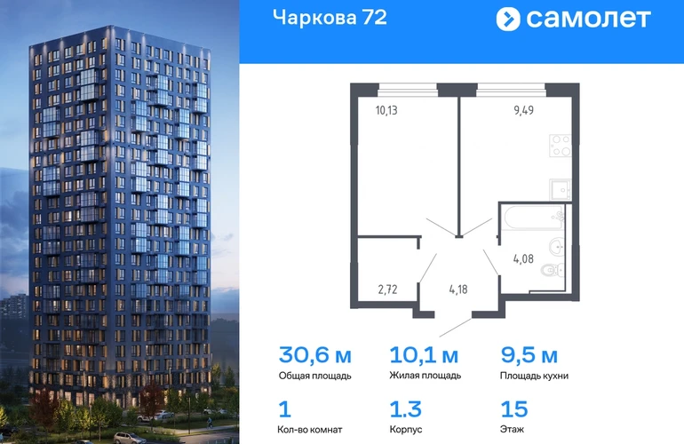 Строим кварталы для жизни с заботой о будущем. Предлагается 1-комнатная квартира комфорт-класса 30,6 кв.м в корпусе 1.3 на 15 этаже, в ЖК «Чаркова 72» Квартира с предчистовой отделкой. Доступность дополнительных опций уточняйте у застройщика. Приобрести квартиру возможно по специальным акциям от застройщика, с текущими условиями акций можно ознакомиться в блоке «Акций». Цена динамическая и может отличаться, уточняйте актуальность у застройщика. Идеальное сочетание городского комфорта и размеренной жизни — квартал «Чаркова 72» на северо-востоке города. В дизайне 17-24-этажных домов с панорамными балконами нашли отражение нотки сибирской природы. От «Чаркова 72» удобно добираться до центра города — всего 17 минут пути. А в 2 минутах от дома находится Тобольский тракт. Для семейного отдыха отлично подойдет парк Гагарина — он находится в 7 минутах от квартала. В закрытых дворах тихо и уютно — все авто остались на одном из 4 многоуровневых паркингов, которые находятся за территорией квартала. Можно спокойно гулять по бульвару и заниматься йогой на спортивной площадке. На первых этажах домов — кафе и магазины. Рядом с проектом — детские сады и школы, городская поликлиника и МФЦ. Во всех квартирах есть выводы под кондиционеры, на подземных этажах — индивидуальные кладовые, на первых — места для хранения велосипедов и колясок. В квартирах можно выбрать варианты отделки: чистовая, черновая и улучшенная из материалов повышенного класса.#yan19-2r1631744#О застройщике