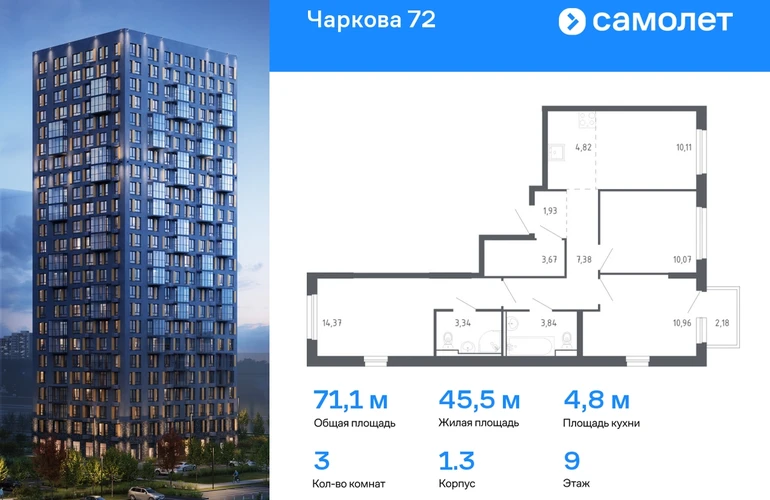 Предлагается 3-комнатная квартира комфорт-класса 71,14 кв.м в корпусе 1.3 на 9 этаже, в ЖК «Чаркова 72» Квартира с предчистовой отделкой. Доступность дополнительных опций уточняйте у застройщика. Приобрести квартиру возможно по специальным акциям от застройщика, с текущими условиями акций можно ознакомиться в блоке “Акций”. Цена динамическая и может отличаться, уточняйте актуальность у застройщика. Идеальное сочетание городского комфорта и размеренной жизни — квартал «Чаркова 72» на северо-востоке города. В дизайне 17-24-этажных домов с панорамными балконами нашли отражение нотки сибирской природы. От «Чаркова 72» удобно добираться до центра города — всего 17 минут пути. А в 2 минутах от дома находится Тобольский тракт. Для семейного отдыха отлично подойдет парк Гагарина — он находится в 7 минутах от квартала. В закрытых дворах тихо и уютно — все авто остались на одном из 4 многоуровневых паркингов, которые находятся за территорией квартала. Можно спокойно гулять по бульвару и заниматься йогой на спортивной площадке. На первых этажах домов — кафе и магазины. Рядом с проектом — детские сады и школы, городская поликлиника и МФЦ. Во всех квартирах есть выводы под кондиционеры, на подземных этажах — индивидуальные кладовые, на первых — места для хранения велосипедов и колясок. В квартирах можно выбрать варианты отделки: чистовая, черновая и улучшенная из материалов повышенного класса.#yan19-2r1631746#О застройщике