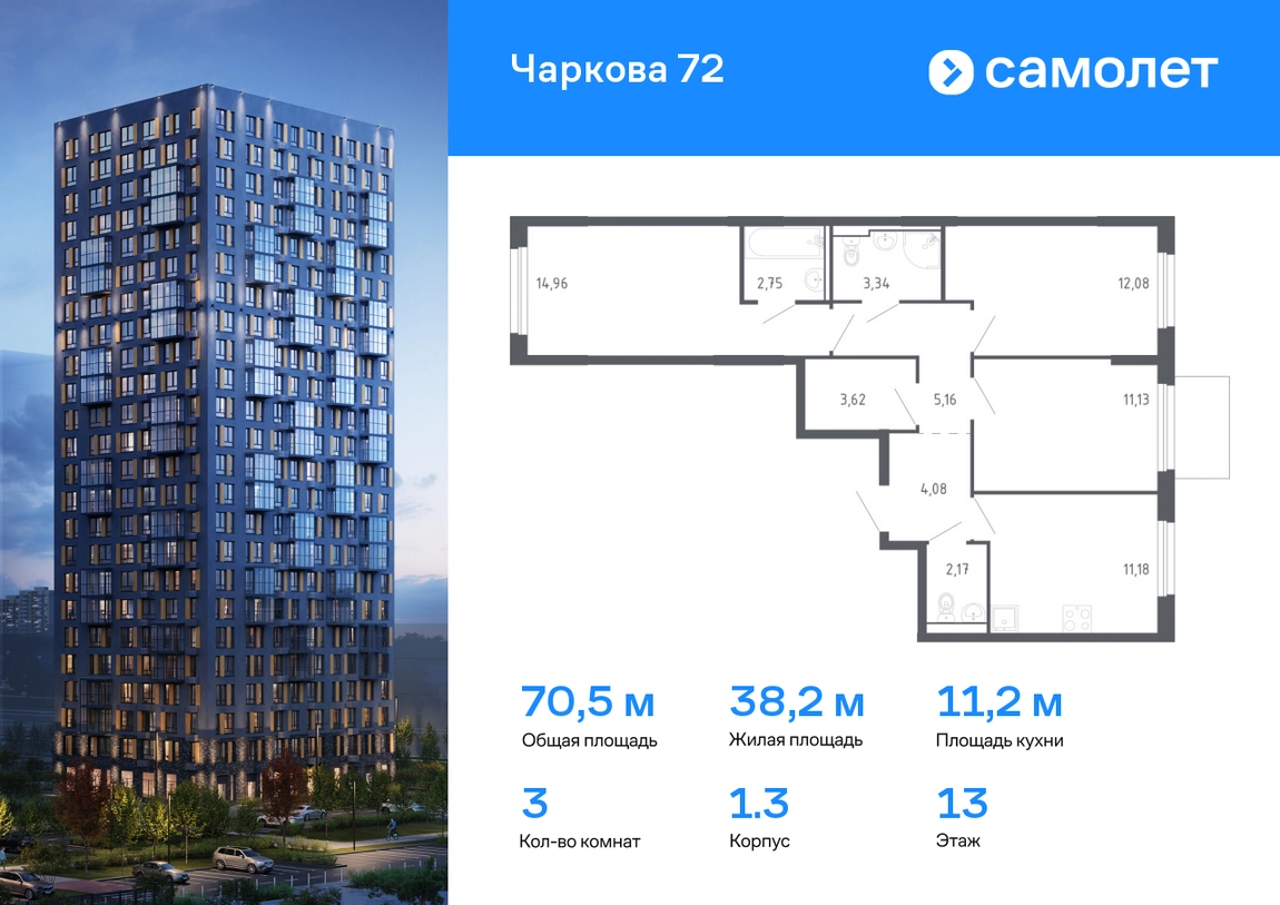 Предлагается 3-комнатная квартира комфорт-класса 70,47 кв.м в корпусе 1.3 на 13 этаже, в ЖК «Чаркова 72» Квартира с предчистовой отделкой. Доступность дополнительных опций уточняйте у застройщика. Приобрести квартиру возможно по специальным акциям от застройщика, с текущими условиями акций можно ознакомиться в блоке “Акций”. Цена динамическая и может отличаться, уточняйте актуальность у застройщика. Идеальное сочетание городского комфорта и размеренной жизни — квартал «Чаркова 72» на северо-востоке города. В дизайне 17-24-этажных домов с панорамными балконами нашли отражение нотки сибирской природы. От «Чаркова 72» удобно добираться до центра города — всего 17 минут пути. А в 2 минутах от дома находится Тобольский тракт. Для семейного отдыха отлично подойдет парк Гагарина — он находится в 7 минутах от квартала. В закрытых дворах тихо и уютно — все авто остались на одном из 4 многоуровневых паркингов, которые находятся за территорией квартала. Можно спокойно гулять по бульвару и заниматься йогой на спортивной площадке. На первых этажах домов — кафе и магазины. Рядом с проектом — детские сады и школы, городская поликлиника и МФЦ. Во всех квартирах есть выводы под кондиционеры, на подземных этажах — индивидуальные кладовые, на первых — места для хранения велосипедов и колясок. В квартирах можно выбрать варианты отделки: чистовая, черновая и улучшенная из материалов повышенного класса.#yan19-2r1631747#О застройщике