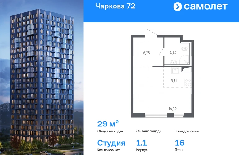 Строим кварталы для жизни с заботой о будущем. Предлагается квартира студия комфорт-класса 29 кв.м в корпусе 1.1 на 16 этаже, в ЖК «Чаркова 72» Квартира с чистовой отделкой. Доступность дополнительных опций уточняйте у застройщика. Приобрести квартиру возможно по специальным акциям от застройщика, с текущими условиями акций можно ознакомиться в блоке «Акций». Цена динамическая и может отличаться, уточняйте актуальность у застройщика. Идеальное сочетание городского комфорта и размеренной жизни — квартал «Чаркова 72» на северо-востоке города. В дизайне 17-24-этажных домов с панорамными балконами нашли отражение нотки сибирской природы. От «Чаркова 72» удобно добираться до центра города — всего 17 минут пути. А в 2 минутах от дома находится Тобольский тракт. Для семейного отдыха отлично подойдет парк Гагарина — он находится в 7 минутах от квартала. В закрытых дворах тихо и уютно — все авто остались на одном из 4 многоуровневых паркингов, которые находятся за территорией квартала. Можно спокойно гулять по бульвару и заниматься йогой на спортивной площадке. На первых этажах домов — кафе и магазины. Рядом с проектом — детские сады и школы, городская поликлиника и МФЦ. Во всех квартирах есть выводы под кондиционеры, на подземных этажах — индивидуальные кладовые, на первых — места для хранения велосипедов и колясок. В квартирах можно выбрать варианты отделки: чистовая, черновая и улучшенная из материалов повышенного класса.#yan19-2r1648493#О застройщике