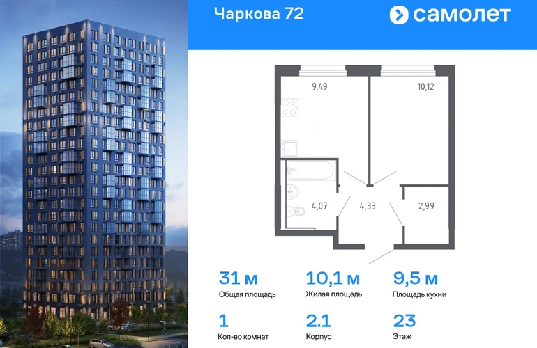 Строим кварталы для жизни с заботой о будущем. Предлагается 1-комнатная квартира комфорт-класса 31 кв.м в корпусе 2.1 на 23 этаже, в ЖК «Чаркова 72» Квартира с чистовой отделкой. Доступность дополнительных опций уточняйте у застройщика. Приобрести квартиру возможно по специальным акциям от застройщика, с текущими условиями акций можно ознакомиться в блоке «Акций». Цена динамическая и может отличаться, уточняйте актуальность у застройщика. Идеальное сочетание городского комфорта и размеренной жизни — квартал «Чаркова 72» на северо-востоке города. В дизайне 17-24-этажных домов с панорамными балконами нашли отражение нотки сибирской природы. От «Чаркова 72» удобно добираться до центра города — всего 17 минут пути. А в 2 минутах от дома находится Тобольский тракт. Для семейного отдыха отлично подойдет парк Гагарина — он находится в 7 минутах от квартала. В закрытых дворах тихо и уютно — все авто остались на одном из 4 многоуровневых паркингов, которые находятся за территорией квартала. Можно спокойно гулять по бульвару и заниматься йогой на спортивной площадке. На первых этажах домов — кафе и магазины. Рядом с проектом — детские сады и школы, городская поликлиника и МФЦ. Во всех квартирах есть выводы под кондиционеры, на подземных этажах — индивидуальные кладовые, на первых — места для хранения велосипедов и колясок. В квартирах можно выбрать варианты отделки: чистовая, черновая и улучшенная из материалов повышенного класса.#yan19-2r1650593#О застройщике