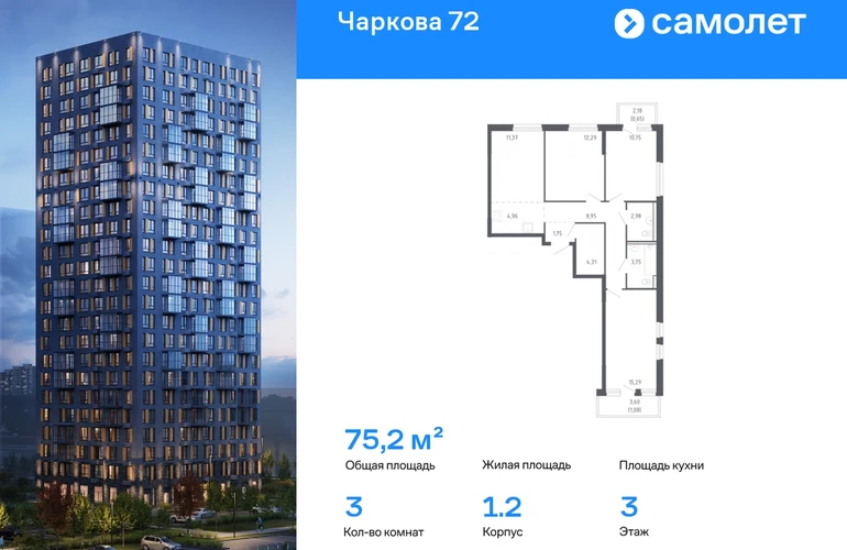 Строим кварталы для жизни с заботой о будущем. Предлагается 3-комнатная квартира комфорт-класса 77 кв.м в корпусе 1.2 на 3 этаже, в ЖК «Чаркова 72» Квартира с чистовой отделкой. Доступность дополнительных опций уточняйте у застройщика. Приобрести квартиру возможно по специальным акциям от застройщика, с текущими условиями акций можно ознакомиться в блоке «Акций». Цена динамическая и может отличаться, уточняйте актуальность у застройщика. Идеальное сочетание городского комфорта и размеренной жизни — квартал «Чаркова 72» на северо-востоке города. В дизайне 17-24-этажных домов с панорамными балконами нашли отражение нотки сибирской природы. От «Чаркова 72» удобно добираться до центра города — всего 17 минут пути. А в 2 минутах от дома находится Тобольский тракт. Для семейного отдыха отлично подойдет парк Гагарина — он находится в 7 минутах от квартала. В закрытых дворах тихо и уютно — все авто остались на одном из 4 многоуровневых паркингов, которые находятся за территорией квартала. Можно спокойно гулять по бульвару и заниматься йогой на спортивной площадке. На первых этажах домов — кафе и магазины. Рядом с проектом — детские сады и школы, городская поликлиника и МФЦ. Во всех квартирах есть выводы под кондиционеры, на подземных этажах — индивидуальные кладовые, на первых — места для хранения велосипедов и колясок. В квартирах можно выбрать варианты отделки: чистовая, черновая и улучшенная из материалов повышенного класса.#yan19-2r1656391#О застройщике