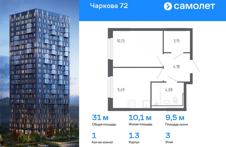 Строим кварталы для жизни с заботой о будущем. Предлагается 1-комнатная квартира комфорт-класса 31,03 кв.м в корпусе 1.3 на 3 этаже, в ЖК «Чаркова 72» Квартира с предчистовой отделкой. Доступность дополнительных опций уточняйте у застройщика. Приобрести квартиру возможно по специальным акциям от застройщика, с текущими условиями акций можно ознакомиться в блоке «Акций». Цена динамическая и может отличаться, уточняйте актуальность у застройщика. Идеальное сочетание городского комфорта и размеренной жизни — квартал «Чаркова 72» на северо-востоке города. В дизайне 17-24-этажных домов с панорамными балконами нашли отражение нотки сибирской природы. От «Чаркова 72» удобно добираться до центра города — всего 17 минут пути. А в 2 минутах от дома находится Тобольский тракт. Для семейного отдыха отлично подойдет парк Гагарина — он находится в 7 минутах от квартала. В закрытых дворах тихо и уютно — все авто остались на одном из 4 многоуровневых паркингов, которые находятся за территорией квартала. Можно спокойно гулять по бульвару и заниматься йогой на спортивной площадке. На первых этажах домов — кафе и магазины. Рядом с проектом — детские сады и школы, городская поликлиника и МФЦ. Во всех квартирах есть выводы под кондиционеры, на подземных этажах — индивидуальные кладовые, на первых — места для хранения велосипедов и колясок. В квартирах можно выбрать варианты отделки: чистовая, черновая и улучшенная из материалов повышенного класса.#yan19-2r1656404#О застройщике