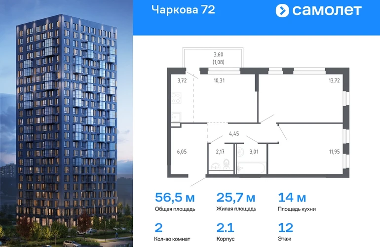 Строим кварталы для жизни с заботой о будущем. Предлагается 2-комнатная квартира комфорт-класса 56,46 кв.м в корпусе 2.1 на 12 этаже, в ЖК «Чаркова 72» Квартира с чистовой отделкой. Доступность дополнительных опций уточняйте у застройщика. Приобрести квартиру возможно по специальным акциям от застройщика, с текущими условиями акций можно ознакомиться в блоке «Акций». Цена динамическая и может отличаться, уточняйте актуальность у застройщика. Идеальное сочетание городского комфорта и размеренной жизни — квартал «Чаркова 72» на северо-востоке города. В дизайне 17-24-этажных домов с панорамными балконами нашли отражение нотки сибирской природы. От «Чаркова 72» удобно добираться до центра города — всего 17 минут пути. А в 2 минутах от дома находится Тобольский тракт. Для семейного отдыха отлично подойдет парк Гагарина — он находится в 7 минутах от квартала. В закрытых дворах тихо и уютно — все авто остались на одном из 4 многоуровневых паркингов, которые находятся за территорией квартала. Можно спокойно гулять по бульвару и заниматься йогой на спортивной площадке. На первых этажах домов — кафе и магазины. Рядом с проектом — детские сады и школы, городская поликлиника и МФЦ. Во всех квартирах есть выводы под кондиционеры, на подземных этажах — индивидуальные кладовые, на первых — места для хранения велосипедов и колясок. В квартирах можно выбрать варианты отделки: чистовая, черновая и улучшенная из материалов повышенного класса.#yan19-2r1665262#О застройщике