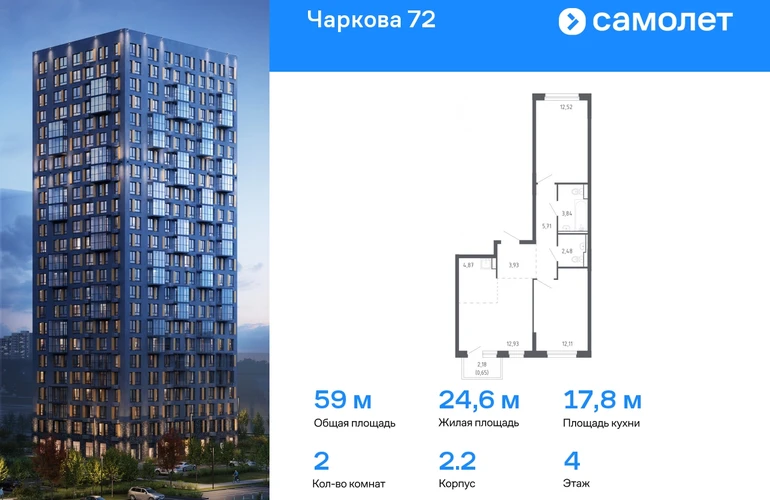 Строим кварталы для жизни с заботой о будущем. Предлагается 2-комнатная квартира комфорт-класса 59,04 кв.м в корпусе 2.2 на 4 этаже, в ЖК «Чаркова 72» Квартира с чистовой отделкой. Доступность дополнительных опций уточняйте у застройщика. Приобрести квартиру возможно по специальным акциям от застройщика, с текущими условиями акций можно ознакомиться в блоке «Акций». Цена динамическая и может отличаться, уточняйте актуальность у застройщика. Идеальное сочетание городского комфорта и размеренной жизни — квартал «Чаркова 72» на северо-востоке города. В дизайне 17-24-этажных домов с панорамными балконами нашли отражение нотки сибирской природы. От «Чаркова 72» удобно добираться до центра города — всего 17 минут пути. А в 2 минутах от дома находится Тобольский тракт. Для семейного отдыха отлично подойдет парк Гагарина — он находится в 7 минутах от квартала. В закрытых дворах тихо и уютно — все авто остались на одном из 4 многоуровневых паркингов, которые находятся за территорией квартала. Можно спокойно гулять по бульвару и заниматься йогой на спортивной площадке. На первых этажах домов — кафе и магазины. Рядом с проектом — детские сады и школы, городская поликлиника и МФЦ. Во всех квартирах есть выводы под кондиционеры, на подземных этажах — индивидуальные кладовые, на первых — места для хранения велосипедов и колясок. В квартирах можно выбрать варианты отделки: чистовая, черновая и улучшенная из материалов повышенного класса.#yan19-2r1665263#О застройщике