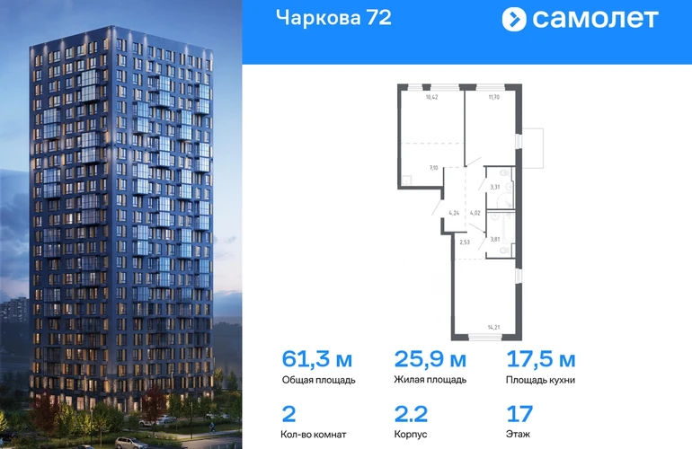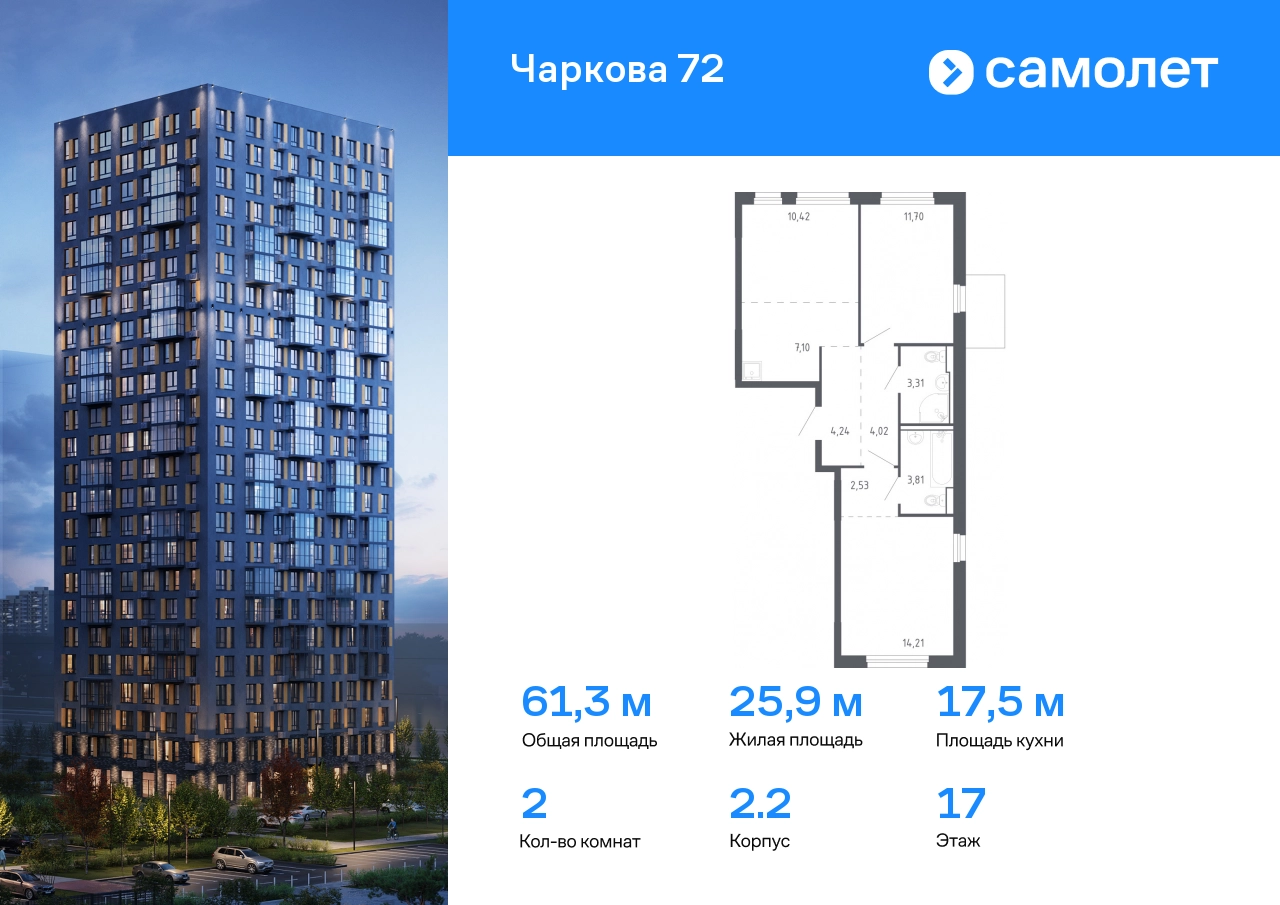 Строим кварталы для жизни с заботой о будущем. Предлагается 2-комнатная квартира комфорт-класса 61,34 кв.м в корпусе 2.2 на 17 этаже, в ЖК «Чаркова 72» Квартира с предчистовой отделкой. Доступность дополнительных опций уточняйте у застройщика. Приобрести квартиру возможно по специальным акциям от застройщика, с текущими условиями акций можно ознакомиться в блоке «Акций». Цена динамическая и может отличаться, уточняйте актуальность у застройщика. Идеальное сочетание городского комфорта и размеренной жизни — квартал «Чаркова 72» на северо-востоке города. В дизайне 17-24-этажных домов с панорамными балконами нашли отражение нотки сибирской природы. От «Чаркова 72» удобно добираться до центра города — всего 17 минут пути. А в 2 минутах от дома находится Тобольский тракт. Для семейного отдыха отлично подойдет парк Гагарина — он находится в 7 минутах от квартала. В закрытых дворах тихо и уютно — все авто остались на одном из 4 многоуровневых паркингов, которые находятся за территорией квартала. Можно спокойно гулять по бульвару и заниматься йогой на спортивной площадке. На первых этажах домов — кафе и магазины. Рядом с проектом — детские сады и школы, городская поликлиника и МФЦ. Во всех квартирах есть выводы под кондиционеры, на подземных этажах — индивидуальные кладовые, на первых — места для хранения велосипедов и колясок. В квартирах можно выбрать варианты отделки: чистовая, черновая и улучшенная из материалов повышенного класса.#yan19-2r1665267#О застройщике