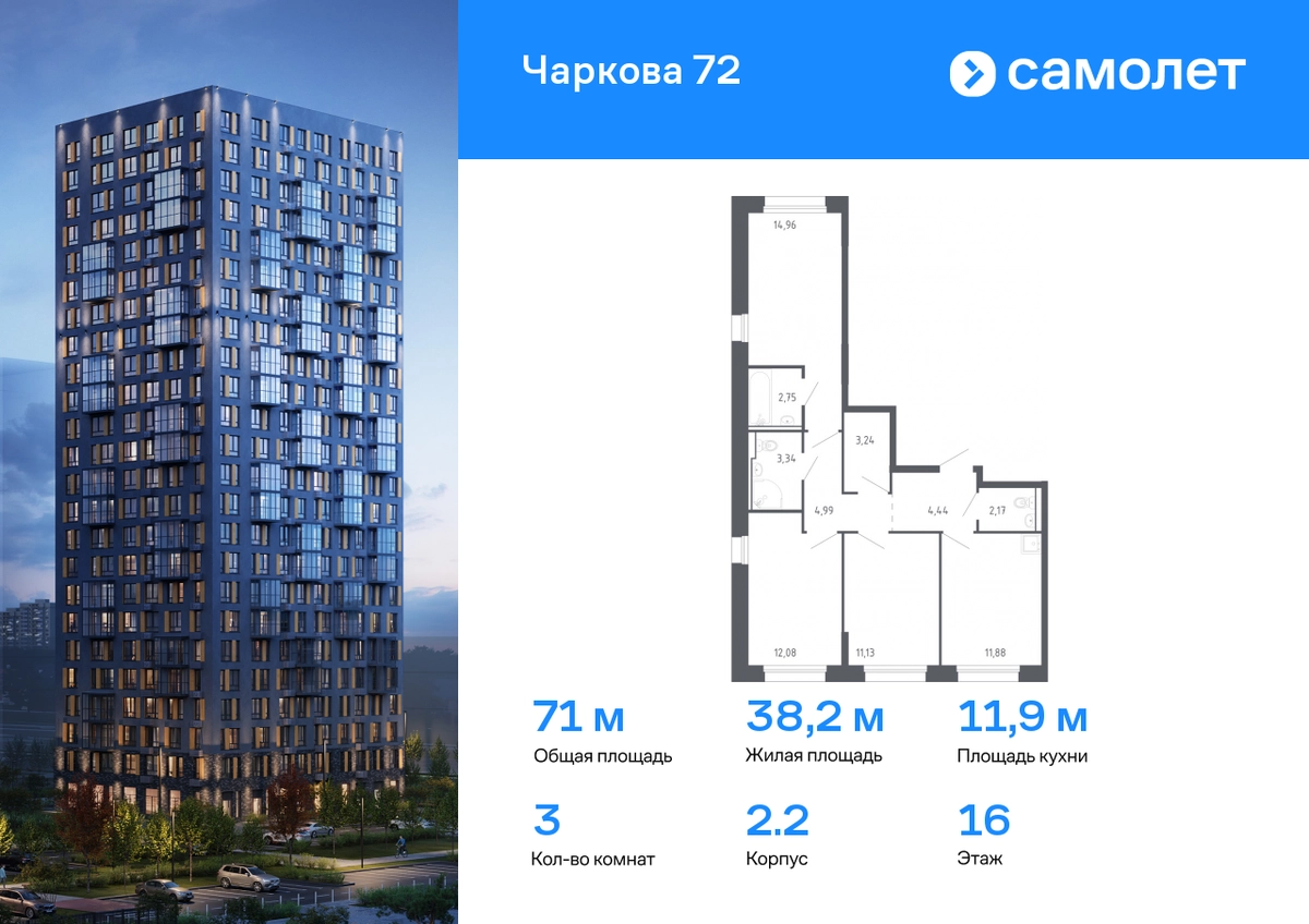 Строим кварталы для жизни с заботой о будущем. Предлагается 3-комнатная квартира комфорт-класса 70,98 кв.м в корпусе 2.2 на 16 этаже, в ЖК «Чаркова 72» Квартира с чистовой отделкой. Доступность дополнительных опций уточняйте у застройщика. Приобрести квартиру возможно по специальным акциям от застройщика, с текущими условиями акций можно ознакомиться в блоке «Акций». Цена динамическая и может отличаться, уточняйте актуальность у застройщика. Идеальное сочетание городского комфорта и размеренной жизни — квартал «Чаркова 72» на северо-востоке города. В дизайне 17-24-этажных домов с панорамными балконами нашли отражение нотки сибирской природы. От «Чаркова 72» удобно добираться до центра города — всего 17 минут пути. А в 2 минутах от дома находится Тобольский тракт. Для семейного отдыха отлично подойдет парк Гагарина — он находится в 7 минутах от квартала. В закрытых дворах тихо и уютно — все авто остались на одном из 4 многоуровневых паркингов, которые находятся за территорией квартала. Можно спокойно гулять по бульвару и заниматься йогой на спортивной площадке. На первых этажах домов — кафе и магазины. Рядом с проектом — детские сады и школы, городская поликлиника и МФЦ. Во всех квартирах есть выводы под кондиционеры, на подземных этажах — индивидуальные кладовые, на первых — места для хранения велосипедов и колясок. В квартирах можно выбрать варианты отделки: чистовая, черновая и улучшенная из материалов повышенного класса.#yan19-2r1667665#О застройщике