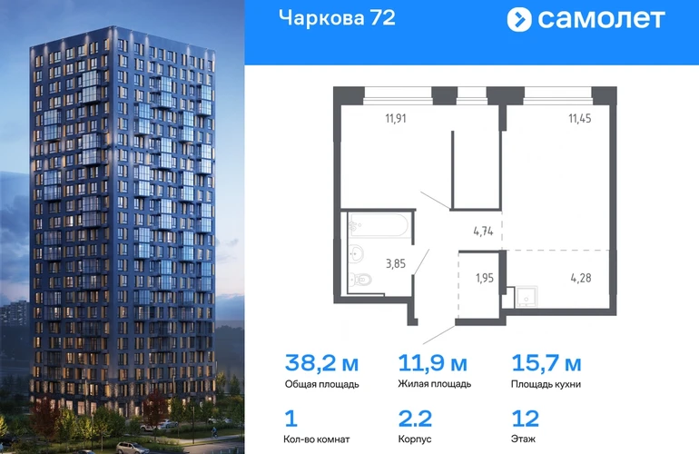 Предлагается 1-комнатная квартира комфорт-класса 38,18 кв.м в корпусе 2.2 на 12 этаже, в ЖК «Чаркова 72» Квартира с предчистовой отделкой. Доступность дополнительных опций уточняйте у застройщика. Приобрести квартиру возможно по специальным акциям от застройщика, с текущими условиями акций можно ознакомиться в блоке “Акций”. Цена динамическая и может отличаться, уточняйте актуальность у застройщика. Идеальное сочетание городского комфорта и размеренной жизни — квартал «Чаркова 72» на северо-востоке города. В дизайне 17-24-этажных домов с панорамными балконами нашли отражение нотки сибирской природы. От «Чаркова 72» удобно добираться до центра города — всего 17 минут пути. А в 2 минутах от дома находится Тобольский тракт. Для семейного отдыха отлично подойдет парк Гагарина — он находится в 7 минутах от квартала. В закрытых дворах тихо и уютно — все авто остались на одном из 4 многоуровневых паркингов, которые находятся за территорией квартала. Можно спокойно гулять по бульвару и заниматься йогой на спортивной площадке. На первых этажах домов — кафе и магазины. Рядом с проектом — детские сады и школы, городская поликлиника и МФЦ. Во всех квартирах есть выводы под кондиционеры, на подземных этажах — индивидуальные кладовые, на первых — места для хранения велосипедов и колясок. В квартирах можно выбрать варианты отделки: чистовая, черновая и улучшенная из материалов повышенного класса.#yan19-2r1670701#О застройщике