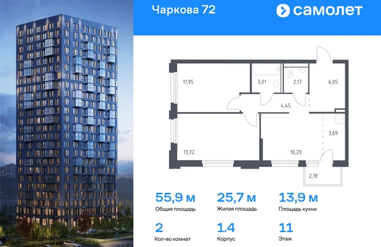 Предлагается 2-комнатная квартира комфорт-класса 55,89 кв.м в корпусе 1.4 на 11 этаже, в ЖК «Чаркова 72» Квартира с чистовой отделкой. Доступность дополнительных опций уточняйте у застройщика. Приобрести квартиру возможно по специальным акциям от застройщика, с текущими условиями акций можно ознакомиться в блоке “Акций”. Цена динамическая и может отличаться, уточняйте актуальность у застройщика. Идеальное сочетание городского комфорта и размеренной жизни — квартал «Чаркова 72» на северо-востоке города. В дизайне 17-24-этажных домов с панорамными балконами нашли отражение нотки сибирской природы. От «Чаркова 72» удобно добираться до центра города — всего 17 минут пути. А в 2 минутах от дома находится Тобольский тракт. Для семейного отдыха отлично подойдет парк Гагарина — он находится в 7 минутах от квартала. В закрытых дворах тихо и уютно — все авто остались на одном из 4 многоуровневых паркингов, которые находятся за территорией квартала. Можно спокойно гулять по бульвару и заниматься йогой на спортивной площадке. На первых этажах домов — кафе и магазины. Рядом с проектом — детские сады и школы, городская поликлиника и МФЦ. Во всех квартирах есть выводы под кондиционеры, на подземных этажах — индивидуальные кладовые, на первых — места для хранения велосипедов и колясок. В квартирах можно выбрать варианты отделки: чистовая, черновая и улучшенная из материалов повышенного класса.#yan19-2r1678031#О застройщике