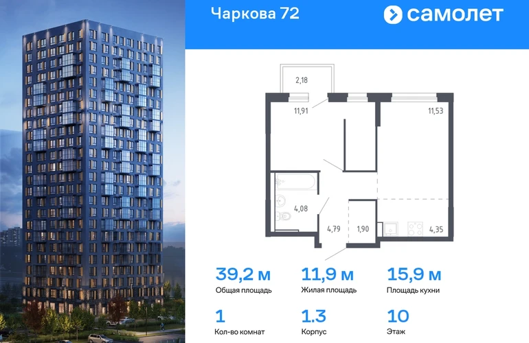 Предлагается 1-комнатная квартира комфорт-класса 39,21 кв.м в корпусе 1.3 на 10 этаже, в ЖК «Чаркова 72» Квартира с чистовой отделкой. Доступность дополнительных опций уточняйте у застройщика. Приобрести квартиру возможно по специальным акциям от застройщика, с текущими условиями акций можно ознакомиться в блоке “Акций”. Цена динамическая и может отличаться, уточняйте актуальность у застройщика. Идеальное сочетание городского комфорта и размеренной жизни — квартал «Чаркова 72» на северо-востоке города. В дизайне 17-24-этажных домов с панорамными балконами нашли отражение нотки сибирской природы. От «Чаркова 72» удобно добираться до центра города — всего 17 минут пути. А в 2 минутах от дома находится Тобольский тракт. Для семейного отдыха отлично подойдет парк Гагарина — он находится в 7 минутах от квартала. В закрытых дворах тихо и уютно — все авто остались на одном из 4 многоуровневых паркингов, которые находятся за территорией квартала. Можно спокойно гулять по бульвару и заниматься йогой на спортивной площадке. На первых этажах домов — кафе и магазины. Рядом с проектом — детские сады и школы, городская поликлиника и МФЦ. Во всех квартирах есть выводы под кондиционеры, на подземных этажах — индивидуальные кладовые, на первых — места для хранения велосипедов и колясок. В квартирах можно выбрать варианты отделки: чистовая, черновая и улучшенная из материалов повышенного класса.#yan19-2r1685210#О застройщике