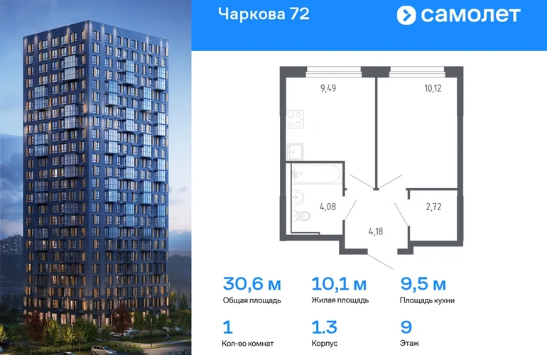 Строим кварталы для жизни с заботой о будущем. Предлагается 1-комнатная квартира комфорт-класса 30,59 кв.м в корпусе 1.3 на 9 этаже, в ЖК «Чаркова 72» Квартира с предчистовой отделкой. Доступность дополнительных опций уточняйте у застройщика. Приобрести квартиру возможно по специальным акциям от застройщика, с текущими условиями акций можно ознакомиться в блоке «Акций». Цена динамическая и может отличаться, уточняйте актуальность у застройщика. Идеальное сочетание городского комфорта и размеренной жизни — квартал «Чаркова 72» на северо-востоке города. В дизайне 17-24-этажных домов с панорамными балконами нашли отражение нотки сибирской природы. От «Чаркова 72» удобно добираться до центра города — всего 17 минут пути. А в 2 минутах от дома находится Тобольский тракт. Для семейного отдыха отлично подойдет парк Гагарина — он находится в 7 минутах от квартала. В закрытых дворах тихо и уютно — все авто остались на одном из 4 многоуровневых паркингов, которые находятся за территорией квартала. Можно спокойно гулять по бульвару и заниматься йогой на спортивной площадке. На первых этажах домов — кафе и магазины. Рядом с проектом — детские сады и школы, городская поликлиника и МФЦ. Во всех квартирах есть выводы под кондиционеры, на подземных этажах — индивидуальные кладовые, на первых — места для хранения велосипедов и колясок. В квартирах можно выбрать варианты отделки: чистовая, черновая и улучшенная из материалов повышенного класса.#yan19-2r1718073#О застройщике