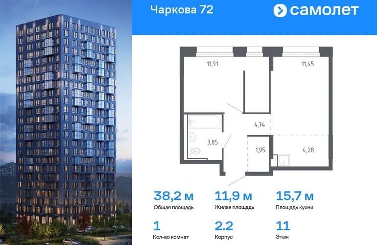 Предлагается 1-комнатная квартира комфорт-класса 38,18 кв.м в корпусе 2.2 на 11 этаже, в ЖК «Чаркова 72» Квартира с чистовой отделкой. Доступность дополнительных опций уточняйте у застройщика. Приобрести квартиру возможно по специальным акциям от застройщика, с текущими условиями акций можно ознакомиться в блоке «Акций». Цена динамическая и может отличаться, уточняйте актуальность у застройщика. Идеальное сочетание городского комфорта и размеренной жизни — квартал «Чаркова 72» на северо-востоке города. В дизайне 17-24-этажных домов с панорамными балконами нашли отражение нотки сибирской природы. От «Чаркова 72» удобно добираться до центра города — всего 17 минут пути. А в 2 минутах от дома находится Тобольский тракт. Для семейного отдыха отлично подойдет парк Гагарина — он находится в 7 минутах от квартала. В закрытых дворах тихо и уютно — все авто остались на одном из 4 многоуровневых паркингов, которые находятся за территорией квартала. Можно спокойно гулять по бульвару и заниматься йогой на спортивной площадке. На первых этажах домов — кафе и магазины. Рядом с проектом — детские сады и школы, городская поликлиника и МФЦ. Во всех квартирах есть выводы под кондиционеры, на подземных этажах — индивидуальные кладовые, на первых — места для хранения велосипедов и колясок. В квартирах можно выбрать варианты отделки: чистовая, черновая и улучшенная из материалов повышенного класса.#yan19-2r1745002#О застройщике