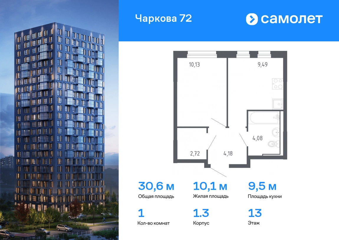 Строим кварталы для жизни с заботой о будущем. Предлагается 1-комнатная квартира комфорт-класса 30,6 кв.м в корпусе 1.3 на 13 этаже, в ЖК «Чаркова 72» Квартира с предчистовой отделкой. Доступность дополнительных опций уточняйте у застройщика. Приобрести квартиру возможно по специальным акциям от застройщика, с текущими условиями акций можно ознакомиться в блоке «Акций». Цена динамическая и может отличаться, уточняйте актуальность у застройщика. Идеальное сочетание городского комфорта и размеренной жизни — квартал «Чаркова 72» на северо-востоке города. В дизайне 17-24-этажных домов с панорамными балконами нашли отражение нотки сибирской природы. От «Чаркова 72» удобно добираться до центра города — всего 17 минут пути. А в 2 минутах от дома находится Тобольский тракт. Для семейного отдыха отлично подойдет парк Гагарина — он находится в 7 минутах от квартала. В закрытых дворах тихо и уютно — все авто остались на одном из 4 многоуровневых паркингов, которые находятся за территорией квартала. Можно спокойно гулять по бульвару и заниматься йогой на спортивной площадке. На первых этажах домов — кафе и магазины. Рядом с проектом — детские сады и школы, городская поликлиника и МФЦ. Во всех квартирах есть выводы под кондиционеры, на подземных этажах — индивидуальные кладовые, на первых — места для хранения велосипедов и колясок. В квартирах можно выбрать варианты отделки: чистовая, черновая и улучшенная из материалов повышенного класса.#yan19-2r1747347#О застройщике