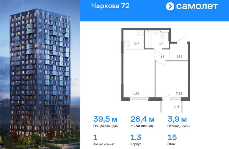 Строим кварталы для жизни с заботой о будущем. Предлагается 1-комнатная квартира комфорт-класса 39,47 кв.м в корпусе 1.3 на 15 этаже, в ЖК «Чаркова 72» Квартира с предчистовой отделкой. Доступность дополнительных опций уточняйте у застройщика. Приобрести квартиру возможно по специальным акциям от застройщика, с текущими условиями акций можно ознакомиться в блоке «Акций». Цена динамическая и может отличаться, уточняйте актуальность у застройщика. Идеальное сочетание городского комфорта и размеренной жизни — квартал «Чаркова 72» на северо-востоке города. В дизайне 17-24-этажных домов с панорамными балконами нашли отражение нотки сибирской природы. От «Чаркова 72» удобно добираться до центра города — всего 17 минут пути. А в 2 минутах от дома находится Тобольский тракт. Для семейного отдыха отлично подойдет парк Гагарина — он находится в 7 минутах от квартала. В закрытых дворах тихо и уютно — все авто остались на одном из 4 многоуровневых паркингов, которые находятся за территорией квартала. Можно спокойно гулять по бульвару и заниматься йогой на спортивной площадке. На первых этажах домов — кафе и магазины. Рядом с проектом — детские сады и школы, городская поликлиника и МФЦ. Во всех квартирах есть выводы под кондиционеры, на подземных этажах — индивидуальные кладовые, на первых — места для хранения велосипедов и колясок. В квартирах можно выбрать варианты отделки: чистовая, черновая и улучшенная из материалов повышенного класса.#yan19-2r1747349#О застройщике