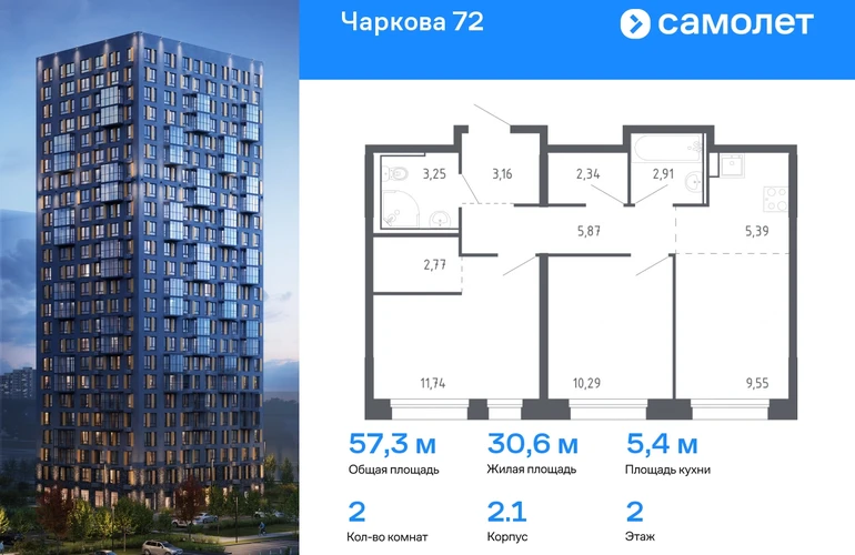 Строим кварталы для жизни с заботой о будущем. Предлагается 2-комнатная квартира комфорт-класса 57,27 кв.м в корпусе 2.1 на 2 этаже, в ЖК «Чаркова 72» Квартира с чистовой отделкой. Доступность дополнительных опций уточняйте у застройщика. Приобрести квартиру возможно по специальным акциям от застройщика, с текущими условиями акций можно ознакомиться в блоке «Акций». Цена динамическая и может отличаться, уточняйте актуальность у застройщика. Идеальное сочетание городского комфорта и размеренной жизни — квартал «Чаркова 72» на северо-востоке города. В дизайне 17-24-этажных домов с панорамными балконами нашли отражение нотки сибирской природы. От «Чаркова 72» удобно добираться до центра города — всего 17 минут пути. А в 2 минутах от дома находится Тобольский тракт. Для семейного отдыха отлично подойдет парк Гагарина — он находится в 7 минутах от квартала. В закрытых дворах тихо и уютно — все авто остались на одном из 4 многоуровневых паркингов, которые находятся за территорией квартала. Можно спокойно гулять по бульвару и заниматься йогой на спортивной площадке. На первых этажах домов — кафе и магазины. Рядом с проектом — детские сады и школы, городская поликлиника и МФЦ. Во всех квартирах есть выводы под кондиционеры, на подземных этажах — индивидуальные кладовые, на первых — места для хранения велосипедов и колясок. В квартирах можно выбрать варианты отделки: чистовая, черновая и улучшенная из материалов повышенного класса.#yan19-2r1747353#О застройщике