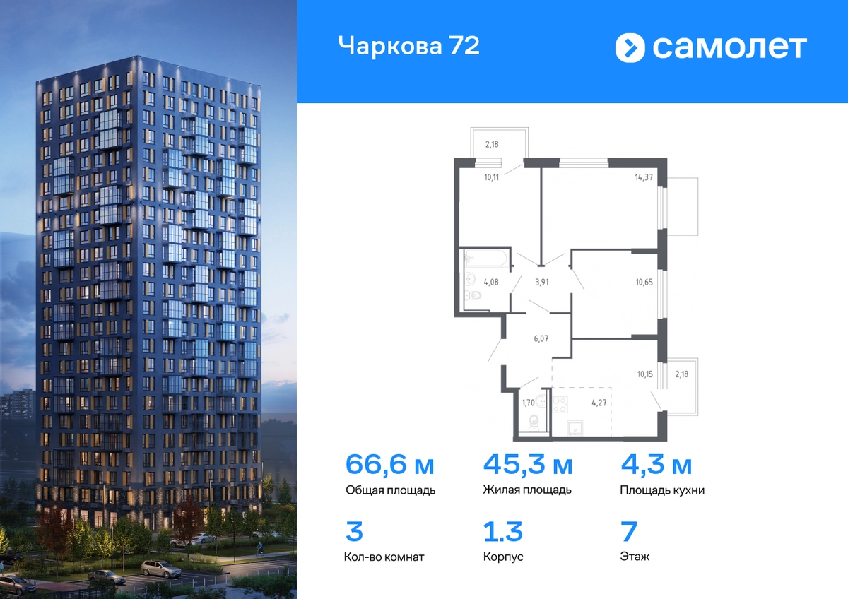 Предлагается 3-комнатная квартира комфорт-класса 66,61 кв.м в корпусе 1.3 на 7 этаже, в ЖК «Чаркова 72» Квартира с предчистовой отделкой. Доступность дополнительных опций уточняйте у застройщика. Планировкой предусмотрены: Прихожая - 6,07 м² Коридор - 3,91 м² Кухня-ниша - 4,27 м² Жилая_комната_1 - 10,15 м² Жилая_комната_2 - 10,65 м² Жилая_комната_3 - 14,37 м² Жилая_комната_4 - 10,11 м² СУ_1 - 4,08 м² СУ_2 - 1,7 м² Балкон - 1,3 м² Приобрести квартиру возможно по специальным акциям от застройщика, с текущими условиями акций можно ознакомиться в блоке “Акций”. Цена динамическая и может отличаться, уточняйте актуальность у застройщика. Идеальное сочетание городского комфорта и размеренной жизни — квартал «Чаркова 72» на северо-востоке города. В дизайне 17-24-этажных домов с панорамными балконами нашли отражение нотки сибирской природы. От «Чаркова 72» удобно добираться до центра города — всего 17 минут пути. А в 2 минутах от дома находится Тобольский тракт. Для семейного отдыха отлично подойдет парк Гагарина — он находится в 7 минутах от квартала. В закрытых дворах тихо и уютно — все авто остались на одном из 4 многоуровневых паркингов, которые находятся за территорией квартала. Можно спокойно гулять по бульвару и заниматься йогой на спортивной площадке. На первых этажах домов — кафе и магазины. Рядом с проектом — детские сады и школы, городская поликлиника и МФЦ. Во всех квартирах есть выводы под кондиционеры, на подземных этажах — индивидуальные кладовые, на первых — места для хранения велосипедов и колясок. В квартирах можно выбрать варианты отделки: чистовая, черновая и улучшенная из материалов повышенного класса.#yan19-2r1754902#О застройщике