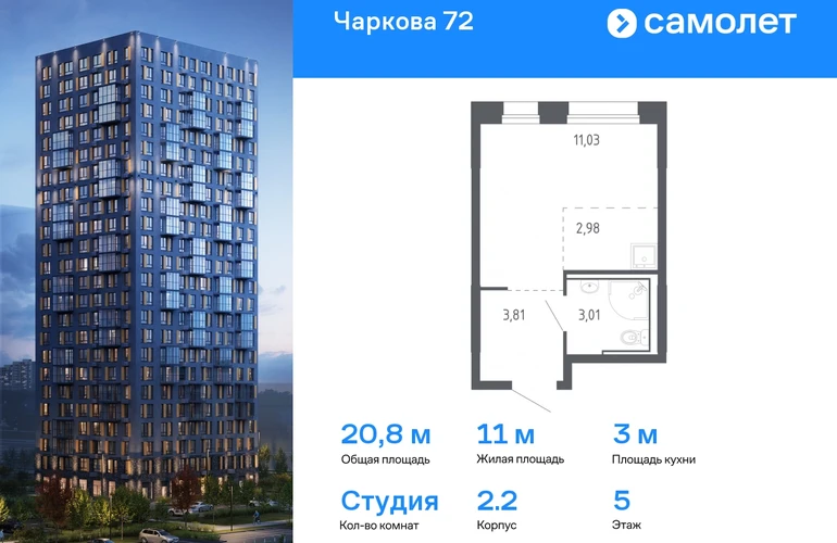 Предлагается квартира студия комфорт-класса 20,83 кв.м в корпусе 2.2 на 5 этаже, в ЖК «Чаркова 72» Квартира с предчистовой отделкой. Доступность дополнительных опций уточняйте у застройщика. Приобрести квартиру возможно по специальным акциям от застройщика, с текущими условиями акций можно ознакомиться в блоке “Акций”. Цена динамическая и может отличаться, уточняйте актуальность у застройщика. Идеальное сочетание городского комфорта и размеренной жизни — квартал «Чаркова 72» на северо-востоке города. В дизайне 17-24-этажных домов с панорамными балконами нашли отражение нотки сибирской природы. От «Чаркова 72» удобно добираться до центра города — всего 17 минут пути. А в 2 минутах от дома находится Тобольский тракт. Для семейного отдыха отлично подойдет парк Гагарина — он находится в 7 минутах от квартала. В закрытых дворах тихо и уютно — все авто остались на одном из 4 многоуровневых паркингов, которые находятся за территорией квартала. Можно спокойно гулять по бульвару и заниматься йогой на спортивной площадке. На первых этажах домов — кафе и магазины. Рядом с проектом — детские сады и школы, городская поликлиника и МФЦ. Во всех квартирах есть выводы под кондиционеры, на подземных этажах — индивидуальные кладовые, на первых — места для хранения велосипедов и колясок. В квартирах можно выбрать варианты отделки: чистовая, черновая и улучшенная из материалов повышенного класса.#yan19-2r1762064#О застройщике