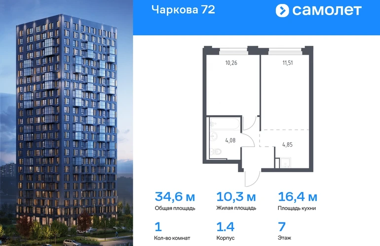 Предлагается 1-комнатная квартира комфорт-класса 34,58 кв.м в корпусе 1.4 на 7 этаже, в ЖК «Чаркова 72» Квартира с чистовой отделкой. Доступность дополнительных опций уточняйте у застройщика. Приобрести квартиру возможно по специальным акциям от застройщика, с текущими условиями акций можно ознакомиться в блоке “Акций”. Цена динамическая и может отличаться, уточняйте актуальность у застройщика. Идеальное сочетание городского комфорта и размеренной жизни — квартал «Чаркова 72» на северо-востоке города. В дизайне 17-24-этажных домов с панорамными балконами нашли отражение нотки сибирской природы. От «Чаркова 72» удобно добираться до центра города — всего 17 минут пути. А в 2 минутах от дома находится Тобольский тракт. Для семейного отдыха отлично подойдет парк Гагарина — он находится в 7 минутах от квартала. В закрытых дворах тихо и уютно — все авто остались на одном из 4 многоуровневых паркингов, которые находятся за территорией квартала. Можно спокойно гулять по бульвару и заниматься йогой на спортивной площадке. На первых этажах домов — кафе и магазины. Рядом с проектом — детские сады и школы, городская поликлиника и МФЦ. Во всех квартирах есть выводы под кондиционеры, на подземных этажах — индивидуальные кладовые, на первых — места для хранения велосипедов и колясок. В квартирах можно выбрать варианты отделки: чистовая, черновая и улучшенная из материалов повышенного класса.#yan19-2r1765249#О застройщике