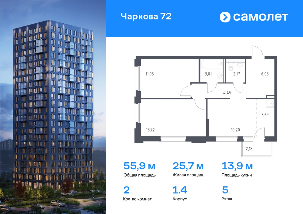 Предлагается 2-комнатная квартира комфорт-класса 55,89 кв.м в корпусе 1.4 на 5 этаже, в ЖК «Чаркова 72» Квартира с чистовой отделкой. Доступность дополнительных опций уточняйте у застройщика. Планировкой предусмотрены: Прихожая - 6,05 м² Коридор - 4,45 м² Кухня-ниша - 3,69 м² Жилая_комната_1 - 10,2 м² Жилая_комната_2 - 13,72 м² Жилая_комната_3 - 11,95 м² СУ_1 - 3,01 м² СУ_2 - 2,17 м² Балкон - 0,65 м² Приобрести квартиру возможно по специальным акциям от застройщика, с текущими условиями акций можно ознакомиться в блоке “Акций”. Цена динамическая и может отличаться, уточняйте актуальность у застройщика. Идеальное сочетание городского комфорта и размеренной жизни — квартал «Чаркова 72» на северо-востоке города. В дизайне 17-24-этажных домов с панорамными балконами нашли отражение нотки сибирской природы. От «Чаркова 72» удобно добираться до центра города — всего 17 минут пути. А в 2 минутах от дома находится Тобольский тракт. Для семейного отдыха отлично подойдет парк Гагарина — он находится в 7 минутах от квартала. В закрытых дворах тихо и уютно — все авто остались на одном из 4 многоуровневых паркингов, которые находятся за территорией квартала. Можно спокойно гулять по бульвару и заниматься йогой на спортивной площадке. На первых этажах домов — кафе и магазины. Рядом с проектом — детские сады и школы, городская поликлиника и МФЦ. Во всех квартирах есть выводы под кондиционеры, на подземных этажах — индивидуальные кладовые, на первых — места для хранения велосипедов и колясок. В квартирах можно выбрать варианты отделки: чистовая, черновая и улучшенная из материалов повышенного класса.#yan19-2r1765251#О застройщике