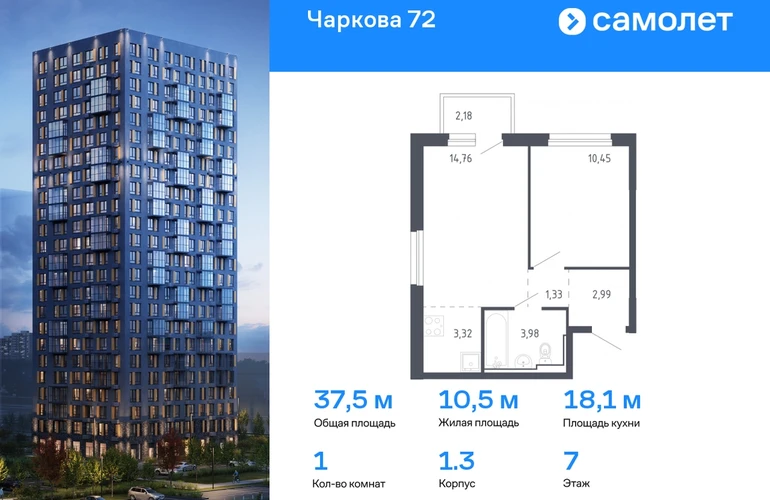Строим кварталы для жизни с заботой о будущем. Предлагается 1-комнатная квартира комфорт-класса 37,48 кв.м в корпусе 1.3 на 7 этаже, в ЖК «Чаркова 72» Квартира с предчистовой отделкой. Доступность дополнительных опций уточняйте у застройщика. Приобрести квартиру возможно по специальным акциям от застройщика, с текущими условиями акций можно ознакомиться в блоке «Акций». Цена динамическая и может отличаться, уточняйте актуальность у застройщика. Идеальное сочетание городского комфорта и размеренной жизни — квартал «Чаркова 72» на северо-востоке города. В дизайне 17-24-этажных домов с панорамными балконами нашли отражение нотки сибирской природы. От «Чаркова 72» удобно добираться до центра города — всего 17 минут пути. А в 2 минутах от дома находится Тобольский тракт. Для семейного отдыха отлично подойдет парк Гагарина — он находится в 7 минутах от квартала. В закрытых дворах тихо и уютно — все авто остались на одном из 4 многоуровневых паркингов, которые находятся за территорией квартала. Можно спокойно гулять по бульвару и заниматься йогой на спортивной площадке. На первых этажах домов — кафе и магазины. Рядом с проектом — детские сады и школы, городская поликлиника и МФЦ. Во всех квартирах есть выводы под кондиционеры, на подземных этажах — индивидуальные кладовые, на первых — места для хранения велосипедов и колясок. В квартирах можно выбрать варианты отделки: чистовая, черновая и улучшенная из материалов повышенного класса.#yan19-2r1765254#О застройщике