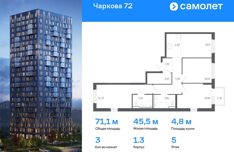 Предлагается 3-комнатная квартира комфорт-класса 71,14 кв.м в корпусе 1.3 на 5 этаже, в ЖК «Чаркова 72» Квартира с предчистовой отделкой. Доступность дополнительных опций уточняйте у застройщика. Планировкой предусмотрены: Прихожая - 1,93 м² Коридор - 7,38 м² Кухня-ниша - 4,82 м² Жилая_комната_1 - 10,07 м² Жилая_комната_2 - 10,96 м² Жилая_комната_3 - 14,37 м² Жилая_комната_4 - 10,11 м² СУ_1 - 3,84 м² СУ_2 - 3,34 м² Гардеробная_1 - 3,67 м² Балкон - 0,65 м² Приобрести квартиру возможно по специальным акциям от застройщика, с текущими условиями акций можно ознакомиться в блоке “Акций”. Цена динамическая и может отличаться, уточняйте актуальность у застройщика. Идеальное сочетание городского комфорта и размеренной жизни — квартал «Чаркова 72» на северо-востоке города. В дизайне 17-24-этажных домов с панорамными балконами нашли отражение нотки сибирской природы. От «Чаркова 72» удобно добираться до центра города — всего 17 минут пути. А в 2 минутах от дома находится Тобольский тракт. Для семейного отдыха отлично подойдет парк Гагарина — он находится в 7 минутах от квартала. В закрытых дворах тихо и уютно — все авто остались на одном из 4 многоуровневых паркингов, которые находятся за территорией квартала. Можно спокойно гулять по бульвару и заниматься йогой на спортивной площадке. На первых этажах домов — кафе и магазины. Рядом с проектом — детские сады и школы, городская поликлиника и МФЦ. Во всех квартирах есть выводы под кондиционеры, на подземных этажах — индивидуальные кладовые, на первых — места для хранения велосипедов и колясок. В квартирах можно выбрать варианты отделки: чистовая, черновая и улучшенная из материалов повышенного класса.#yan19-2r1765265#О застройщике