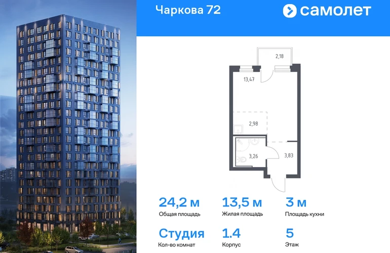 Предлагается квартира студия комфорт-класса 24,19 кв.м в корпусе 1.4 на 5 этаже, в ЖК «Чаркова 72» Квартира с чистовой отделкой. Доступность дополнительных опций уточняйте у застройщика. Приобрести квартиру возможно по специальным акциям от застройщика, с текущими условиями акций можно ознакомиться в блоке “Акций”. Цена динамическая и может отличаться, уточняйте актуальность у застройщика. Идеальное сочетание городского комфорта и размеренной жизни — квартал «Чаркова 72» на северо-востоке города. В дизайне 17-24-этажных домов с панорамными балконами нашли отражение нотки сибирской природы. От «Чаркова 72» удобно добираться до центра города — всего 17 минут пути. А в 2 минутах от дома находится Тобольский тракт. Для семейного отдыха отлично подойдет парк Гагарина — он находится в 7 минутах от квартала. В закрытых дворах тихо и уютно — все авто остались на одном из 4 многоуровневых паркингов, которые находятся за территорией квартала. Можно спокойно гулять по бульвару и заниматься йогой на спортивной площадке. На первых этажах домов — кафе и магазины. Рядом с проектом — детские сады и школы, городская поликлиника и МФЦ. Во всех квартирах есть выводы под кондиционеры, на подземных этажах — индивидуальные кладовые, на первых — места для хранения велосипедов и колясок. В квартирах можно выбрать варианты отделки: чистовая, черновая и улучшенная из материалов повышенного класса.#yan19-2r1765990#О застройщике