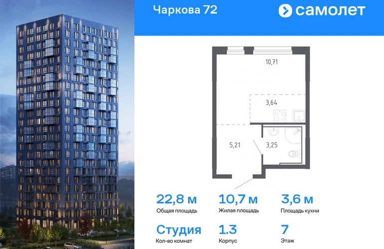 Предлагается квартира студия комфорт-класса 22,81 кв.м в корпусе 1.3 на 7 этаже, в ЖК «Чаркова 72» Квартира с предчистовой отделкой. Доступность дополнительных опций уточняйте у застройщика. Приобрести квартиру возможно по специальным акциям от застройщика, с текущими условиями акций можно ознакомиться в блоке “Акций”. Цена динамическая и может отличаться, уточняйте актуальность у застройщика. Идеальное сочетание городского комфорта и размеренной жизни — квартал «Чаркова 72» на северо-востоке города. В дизайне 17-24-этажных домов с панорамными балконами нашли отражение нотки сибирской природы. От «Чаркова 72» удобно добираться до центра города — всего 17 минут пути. А в 2 минутах от дома находится Тобольский тракт. Для семейного отдыха отлично подойдет парк Гагарина — он находится в 7 минутах от квартала. В закрытых дворах тихо и уютно — все авто остались на одном из 4 многоуровневых паркингов, которые находятся за территорией квартала. Можно спокойно гулять по бульвару и заниматься йогой на спортивной площадке. На первых этажах домов — кафе и магазины. Рядом с проектом — детские сады и школы, городская поликлиника и МФЦ. Во всех квартирах есть выводы под кондиционеры, на подземных этажах — индивидуальные кладовые, на первых — места для хранения велосипедов и колясок. В квартирах можно выбрать варианты отделки: чистовая, черновая и улучшенная из материалов повышенного класса.#yan19-2r1765995#О застройщике