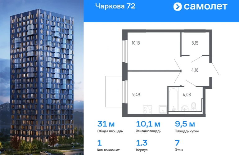 Строим кварталы для жизни с заботой о будущем. Предлагается 1-комнатная квартира комфорт-класса 31,03 кв.м в корпусе 1.3 на 7 этаже, в ЖК «Чаркова 72» Квартира с предчистовой отделкой. Доступность дополнительных опций уточняйте у застройщика. Приобрести квартиру возможно по специальным акциям от застройщика, с текущими условиями акций можно ознакомиться в блоке «Акций». Цена динамическая и может отличаться, уточняйте актуальность у застройщика. Идеальное сочетание городского комфорта и размеренной жизни — квартал «Чаркова 72» на северо-востоке города. В дизайне 17-24-этажных домов с панорамными балконами нашли отражение нотки сибирской природы. От «Чаркова 72» удобно добираться до центра города — всего 17 минут пути. А в 2 минутах от дома находится Тобольский тракт. Для семейного отдыха отлично подойдет парк Гагарина — он находится в 7 минутах от квартала. В закрытых дворах тихо и уютно — все авто остались на одном из 4 многоуровневых паркингов, которые находятся за территорией квартала. Можно спокойно гулять по бульвару и заниматься йогой на спортивной площадке. На первых этажах домов — кафе и магазины. Рядом с проектом — детские сады и школы, городская поликлиника и МФЦ. Во всех квартирах есть выводы под кондиционеры, на подземных этажах — индивидуальные кладовые, на первых — места для хранения велосипедов и колясок. В квартирах можно выбрать варианты отделки: чистовая, черновая и улучшенная из материалов повышенного класса.#yan19-2r1765997#О застройщике