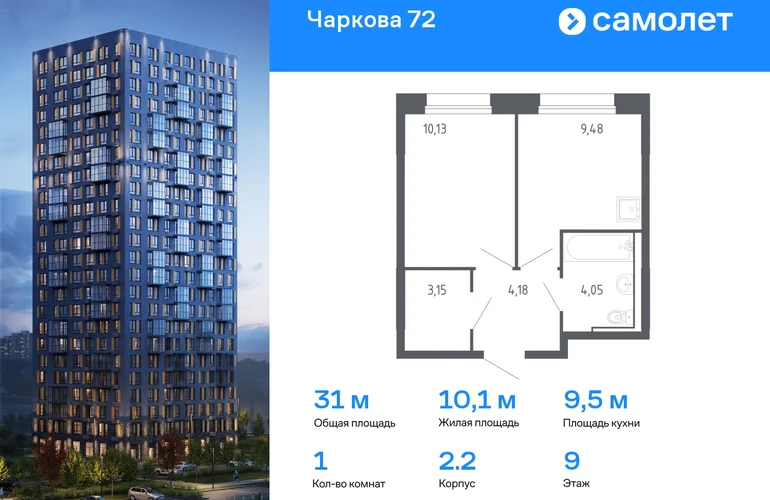 Строим кварталы для жизни с заботой о будущем. Предлагается 1-комнатная квартира комфорт-класса 30,99 кв.м в корпусе 2.2 на 9 этаже, в ЖК «Чаркова 72» Квартира с предчистовой отделкой. Доступность дополнительных опций уточняйте у застройщика. Приобрести квартиру возможно по специальным акциям от застройщика, с текущими условиями акций можно ознакомиться в блоке «Акций». Цена динамическая и может отличаться, уточняйте актуальность у застройщика. Идеальное сочетание городского комфорта и размеренной жизни — квартал «Чаркова 72» на северо-востоке города. В дизайне 17-24-этажных домов с панорамными балконами нашли отражение нотки сибирской природы. От «Чаркова 72» удобно добираться до центра города — всего 17 минут пути. А в 2 минутах от дома находится Тобольский тракт. Для семейного отдыха отлично подойдет парк Гагарина — он находится в 7 минутах от квартала. В закрытых дворах тихо и уютно — все авто остались на одном из 4 многоуровневых паркингов, которые находятся за территорией квартала. Можно спокойно гулять по бульвару и заниматься йогой на спортивной площадке. На первых этажах домов — кафе и магазины. Рядом с проектом — детские сады и школы, городская поликлиника и МФЦ. Во всех квартирах есть выводы под кондиционеры, на подземных этажах — индивидуальные кладовые, на первых — места для хранения велосипедов и колясок. В квартирах можно выбрать варианты отделки: чистовая, черновая и улучшенная из материалов повышенного класса.#yan19-2r1769609#О застройщике