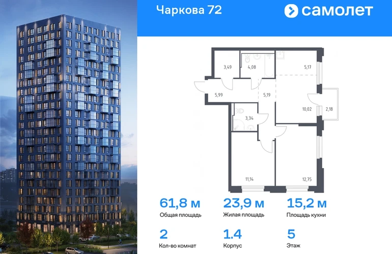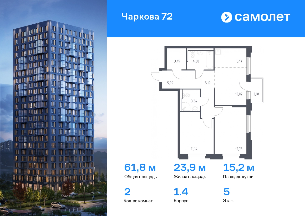 Предлагается 2-комнатная квартира комфорт-класса 61,82 кв.м в корпусе 1.4 на 5 этаже, в ЖК «Чаркова 72» Квартира с чистовой отделкой. Доступность дополнительных опций уточняйте у застройщика. Приобрести квартиру возможно по специальным акциям от застройщика, с текущими условиями акций можно ознакомиться в блоке “Акций”. Цена динамическая и может отличаться, уточняйте актуальность у застройщика. Идеальное сочетание городского комфорта и размеренной жизни — квартал «Чаркова 72» на северо-востоке города. В дизайне 17-24-этажных домов с панорамными балконами нашли отражение нотки сибирской природы. От «Чаркова 72» удобно добираться до центра города — всего 17 минут пути. А в 2 минутах от дома находится Тобольский тракт. Для семейного отдыха отлично подойдет парк Гагарина — он находится в 7 минутах от квартала. В закрытых дворах тихо и уютно — все авто остались на одном из 4 многоуровневых паркингов, которые находятся за территорией квартала. Можно спокойно гулять по бульвару и заниматься йогой на спортивной площадке. На первых этажах домов — кафе и магазины. Рядом с проектом — детские сады и школы, городская поликлиника и МФЦ. Во всех квартирах есть выводы под кондиционеры, на подземных этажах — индивидуальные кладовые, на первых — места для хранения велосипедов и колясок. В квартирах можно выбрать варианты отделки: чистовая, черновая и улучшенная из материалов повышенного класса.#yan19-2r1775625#О застройщике