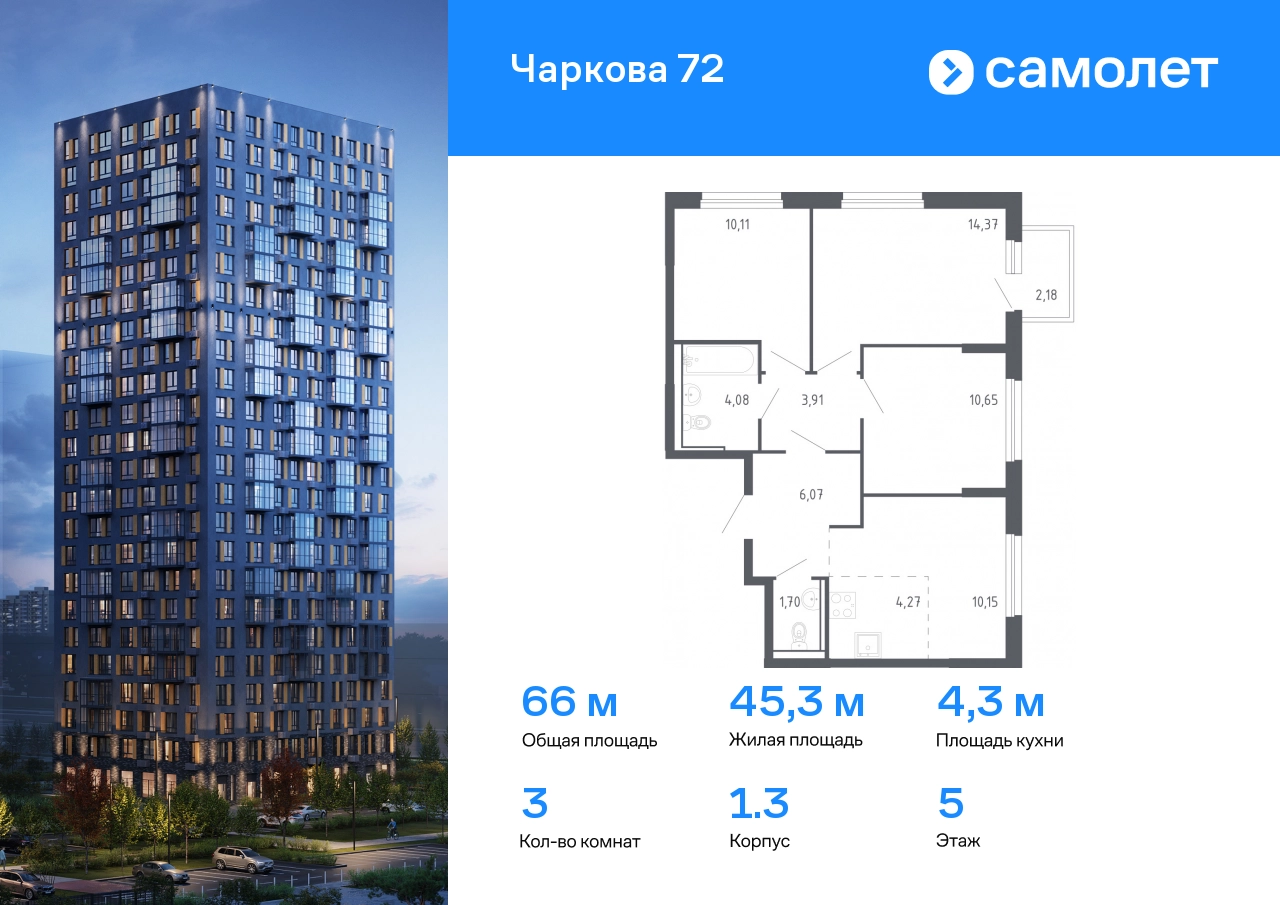 Предлагается 3-комнатная квартира комфорт-класса 65,96 кв.м в корпусе 1.3 на 5 этаже, в ЖК «Чаркова 72» Квартира с предчистовой отделкой. Доступность дополнительных опций уточняйте у застройщика. Приобрести квартиру возможно по специальным акциям от застройщика, с текущими условиями акций можно ознакомиться в блоке “Акций”. Цена динамическая и может отличаться, уточняйте актуальность у застройщика. Идеальное сочетание городского комфорта и размеренной жизни — квартал «Чаркова 72» на северо-востоке города. В дизайне 17-24-этажных домов с панорамными балконами нашли отражение нотки сибирской природы. От «Чаркова 72» удобно добираться до центра города — всего 17 минут пути. А в 2 минутах от дома находится Тобольский тракт. Для семейного отдыха отлично подойдет парк Гагарина — он находится в 7 минутах от квартала. В закрытых дворах тихо и уютно — все авто остались на одном из 4 многоуровневых паркингов, которые находятся за территорией квартала. Можно спокойно гулять по бульвару и заниматься йогой на спортивной площадке. На первых этажах домов — кафе и магазины. Рядом с проектом — детские сады и школы, городская поликлиника и МФЦ. Во всех квартирах есть выводы под кондиционеры, на подземных этажах — индивидуальные кладовые, на первых — места для хранения велосипедов и колясок. В квартирах можно выбрать варианты отделки: чистовая, черновая и улучшенная из материалов повышенного класса.#yan19-2r1775631#О застройщике