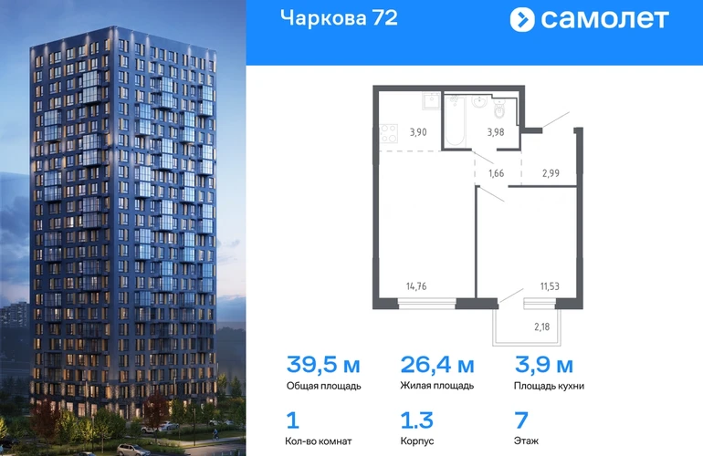 Строим кварталы для жизни с заботой о будущем. Предлагается 1-комнатная квартира комфорт-класса 39,47 кв.м в корпусе 1.3 на 7 этаже, в ЖК «Чаркова 72» Квартира с предчистовой отделкой. Доступность дополнительных опций уточняйте у застройщика. Приобрести квартиру возможно по специальным акциям от застройщика, с текущими условиями акций можно ознакомиться в блоке «Акций». Цена динамическая и может отличаться, уточняйте актуальность у застройщика. Идеальное сочетание городского комфорта и размеренной жизни — квартал «Чаркова 72» на северо-востоке города. В дизайне 17-24-этажных домов с панорамными балконами нашли отражение нотки сибирской природы. От «Чаркова 72» удобно добираться до центра города — всего 17 минут пути. А в 2 минутах от дома находится Тобольский тракт. Для семейного отдыха отлично подойдет парк Гагарина — он находится в 7 минутах от квартала. В закрытых дворах тихо и уютно — все авто остались на одном из 4 многоуровневых паркингов, которые находятся за территорией квартала. Можно спокойно гулять по бульвару и заниматься йогой на спортивной площадке. На первых этажах домов — кафе и магазины. Рядом с проектом — детские сады и школы, городская поликлиника и МФЦ. Во всех квартирах есть выводы под кондиционеры, на подземных этажах — индивидуальные кладовые, на первых — места для хранения велосипедов и колясок. В квартирах можно выбрать варианты отделки: чистовая, черновая и улучшенная из материалов повышенного класса.#yan19-2r1775632#О застройщике