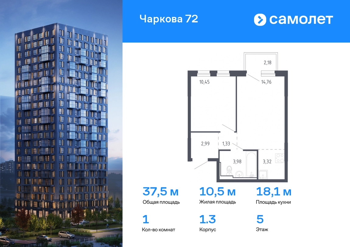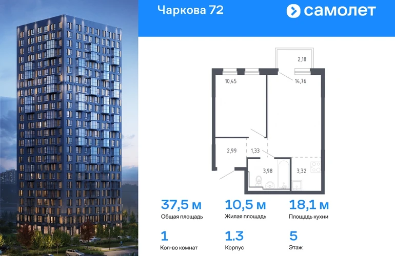 Строим кварталы для жизни с заботой о будущем. Предлагается 1-комнатная квартира комфорт-класса 37,48 кв.м в корпусе 1.3 на 5 этаже, в ЖК «Чаркова 72» Квартира с предчистовой отделкой. Доступность дополнительных опций уточняйте у застройщика. Приобрести квартиру возможно по специальным акциям от застройщика, с текущими условиями акций можно ознакомиться в блоке «Акций». Цена динамическая и может отличаться, уточняйте актуальность у застройщика. Идеальное сочетание городского комфорта и размеренной жизни — квартал «Чаркова 72» на северо-востоке города. В дизайне 17-24-этажных домов с панорамными балконами нашли отражение нотки сибирской природы. От «Чаркова 72» удобно добираться до центра города — всего 17 минут пути. А в 2 минутах от дома находится Тобольский тракт. Для семейного отдыха отлично подойдет парк Гагарина — он находится в 7 минутах от квартала. В закрытых дворах тихо и уютно — все авто остались на одном из 4 многоуровневых паркингов, которые находятся за территорией квартала. Можно спокойно гулять по бульвару и заниматься йогой на спортивной площадке. На первых этажах домов — кафе и магазины. Рядом с проектом — детские сады и школы, городская поликлиника и МФЦ. Во всех квартирах есть выводы под кондиционеры, на подземных этажах — индивидуальные кладовые, на первых — места для хранения велосипедов и колясок. В квартирах можно выбрать варианты отделки: чистовая, черновая и улучшенная из материалов повышенного класса.#yan19-2r1778093#О застройщике