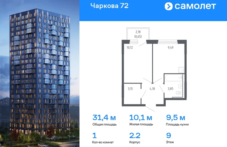 Строим кварталы для жизни с заботой о будущем. Предлагается 1-комнатная квартира комфорт-класса 31,44 кв.м в корпусе 2.2 на 9 этаже, в ЖК «Чаркова 72» Квартира с предчистовой отделкой. Доступность дополнительных опций уточняйте у застройщика. Приобрести квартиру возможно по специальным акциям от застройщика, с текущими условиями акций можно ознакомиться в блоке «Акций». Цена динамическая и может отличаться, уточняйте актуальность у застройщика. Идеальное сочетание городского комфорта и размеренной жизни — квартал «Чаркова 72» на северо-востоке города. В дизайне 17-24-этажных домов с панорамными балконами нашли отражение нотки сибирской природы. От «Чаркова 72» удобно добираться до центра города — всего 17 минут пути. А в 2 минутах от дома находится Тобольский тракт. Для семейного отдыха отлично подойдет парк Гагарина — он находится в 7 минутах от квартала. В закрытых дворах тихо и уютно — все авто остались на одном из 4 многоуровневых паркингов, которые находятся за территорией квартала. Можно спокойно гулять по бульвару и заниматься йогой на спортивной площадке. На первых этажах домов — кафе и магазины. Рядом с проектом — детские сады и школы, городская поликлиника и МФЦ. Во всех квартирах есть выводы под кондиционеры, на подземных этажах — индивидуальные кладовые, на первых — места для хранения велосипедов и колясок. В квартирах можно выбрать варианты отделки: чистовая, черновая и улучшенная из материалов повышенного класса.#yan19-2r1784431#О застройщике