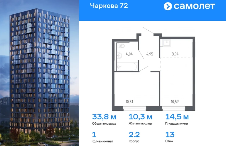 Строим кварталы для жизни с заботой о будущем. Предлагается 1-комнатная квартира комфорт-класса 33,81 кв.м в корпусе 2.2 на 13 этаже, в ЖК «Чаркова 72» Квартира с предчистовой отделкой. Доступность дополнительных опций уточняйте у застройщика. Приобрести квартиру возможно по специальным акциям от застройщика, с текущими условиями акций можно ознакомиться в блоке «Акций». Цена динамическая и может отличаться, уточняйте актуальность у застройщика. Идеальное сочетание городского комфорта и размеренной жизни — квартал «Чаркова 72» на северо-востоке города. В дизайне 17-24-этажных домов с панорамными балконами нашли отражение нотки сибирской природы. От «Чаркова 72» удобно добираться до центра города — всего 17 минут пути. А в 2 минутах от дома находится Тобольский тракт. Для семейного отдыха отлично подойдет парк Гагарина — он находится в 7 минутах от квартала. В закрытых дворах тихо и уютно — все авто остались на одном из 4 многоуровневых паркингов, которые находятся за территорией квартала. Можно спокойно гулять по бульвару и заниматься йогой на спортивной площадке. На первых этажах домов — кафе и магазины. Рядом с проектом — детские сады и школы, городская поликлиника и МФЦ. Во всех квартирах есть выводы под кондиционеры, на подземных этажах — индивидуальные кладовые, на первых — места для хранения велосипедов и колясок. В квартирах можно выбрать варианты отделки: чистовая, черновая и улучшенная из материалов повышенного класса.#yan19-2r1787307#О застройщике
