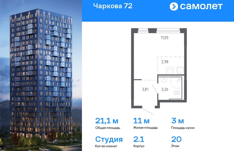 Предлагается квартира студия комфорт-класса 21,08 кв.м в корпусе 2.1 на 20 этаже, в ЖК «Чаркова 72» Квартира с чистовой отделкой. Доступность дополнительных опций уточняйте у застройщика. Приобрести квартиру возможно по специальным акциям от застройщика, с текущими условиями акций можно ознакомиться в блоке “Акций”. Цена динамическая и может отличаться, уточняйте актуальность у застройщика. Идеальное сочетание городского комфорта и размеренной жизни — квартал «Чаркова 72» на северо-востоке города. В дизайне 17-24-этажных домов с панорамными балконами нашли отражение нотки сибирской природы. От «Чаркова 72» удобно добираться до центра города — всего 17 минут пути. А в 2 минутах от дома находится Тобольский тракт. Для семейного отдыха отлично подойдет парк Гагарина — он находится в 7 минутах от квартала. В закрытых дворах тихо и уютно — все авто остались на одном из 4 многоуровневых паркингов, которые находятся за территорией квартала. Можно спокойно гулять по бульвару и заниматься йогой на спортивной площадке. На первых этажах домов — кафе и магазины. Рядом с проектом — детские сады и школы, городская поликлиника и МФЦ. Во всех квартирах есть выводы под кондиционеры, на подземных этажах — индивидуальные кладовые, на первых — места для хранения велосипедов и колясок. В квартирах можно выбрать варианты отделки: чистовая, черновая и улучшенная из материалов повышенного класса.#yan19-2r1790226#О застройщике